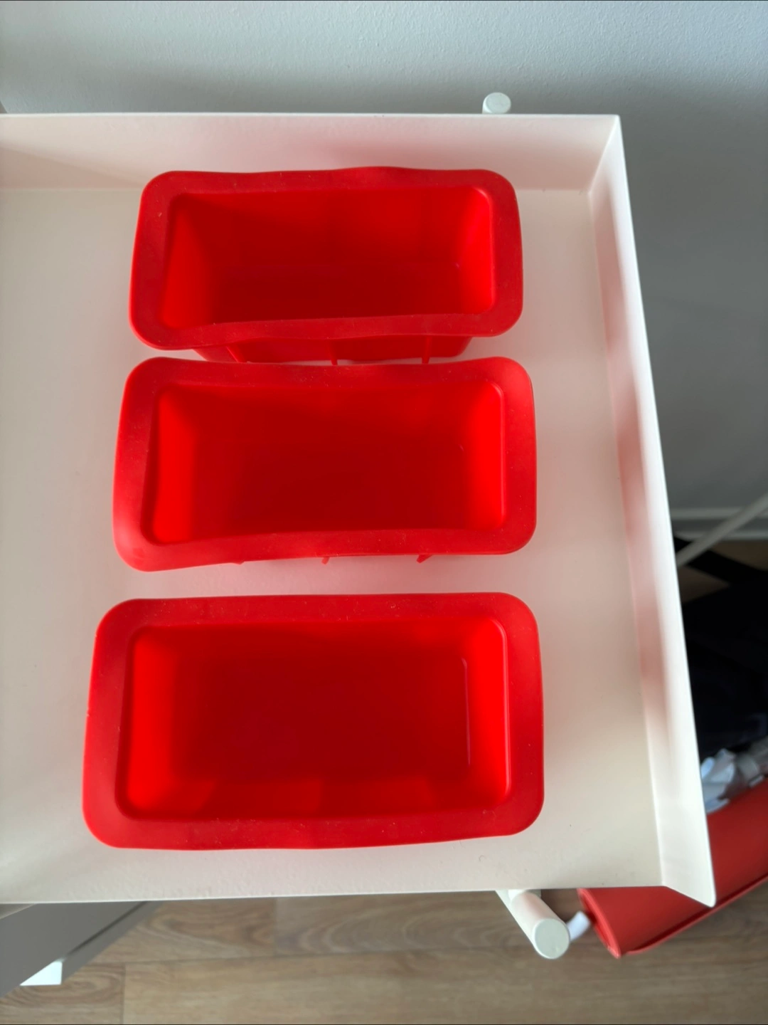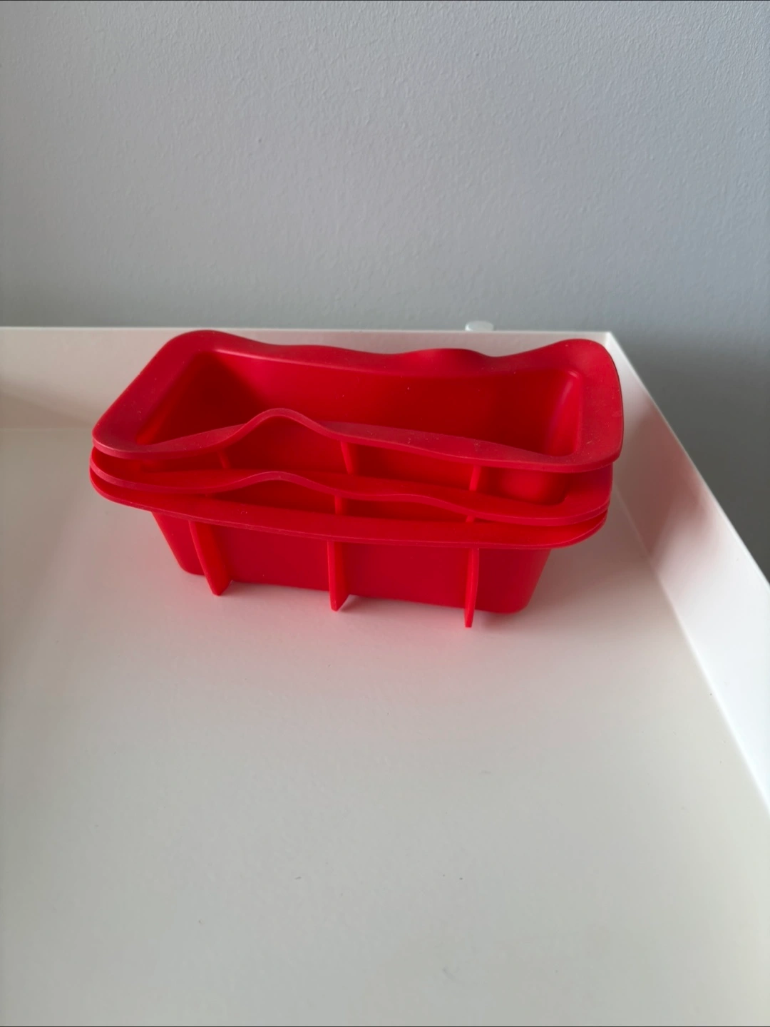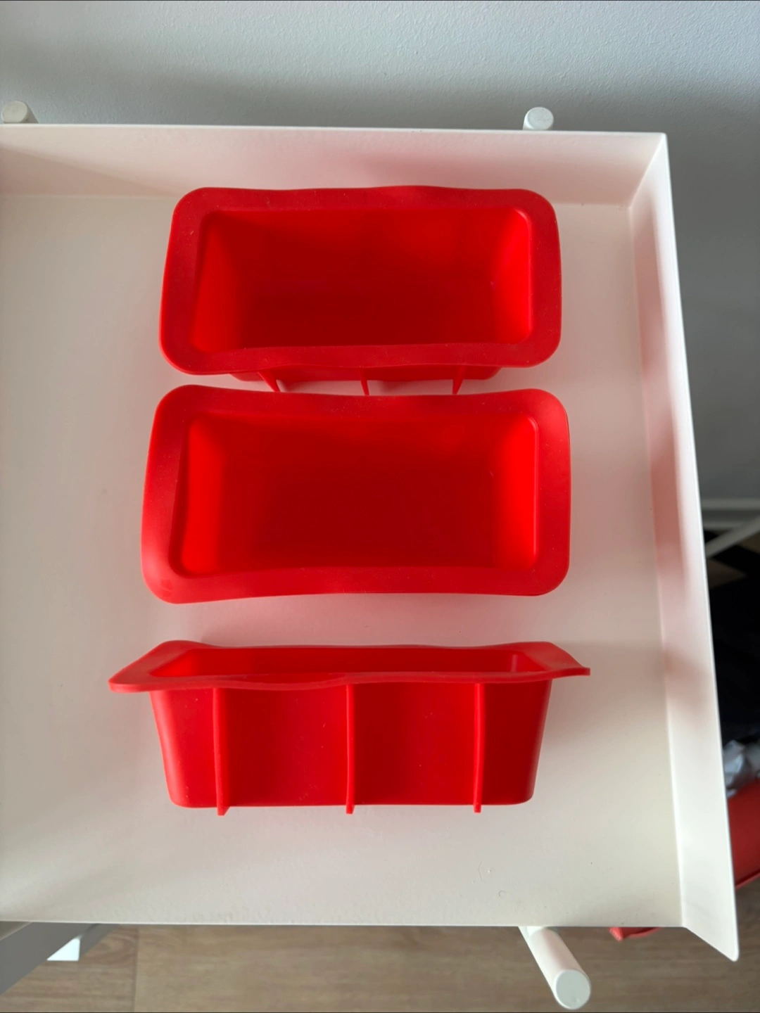 Selling a set of three red silicone mini loaf pans! Perfect for baking small treats or individual portions. Used once. Mini Set of 3(6.4''l X 3.3''w X 1.9''h) Purchased for $22 on Amazon