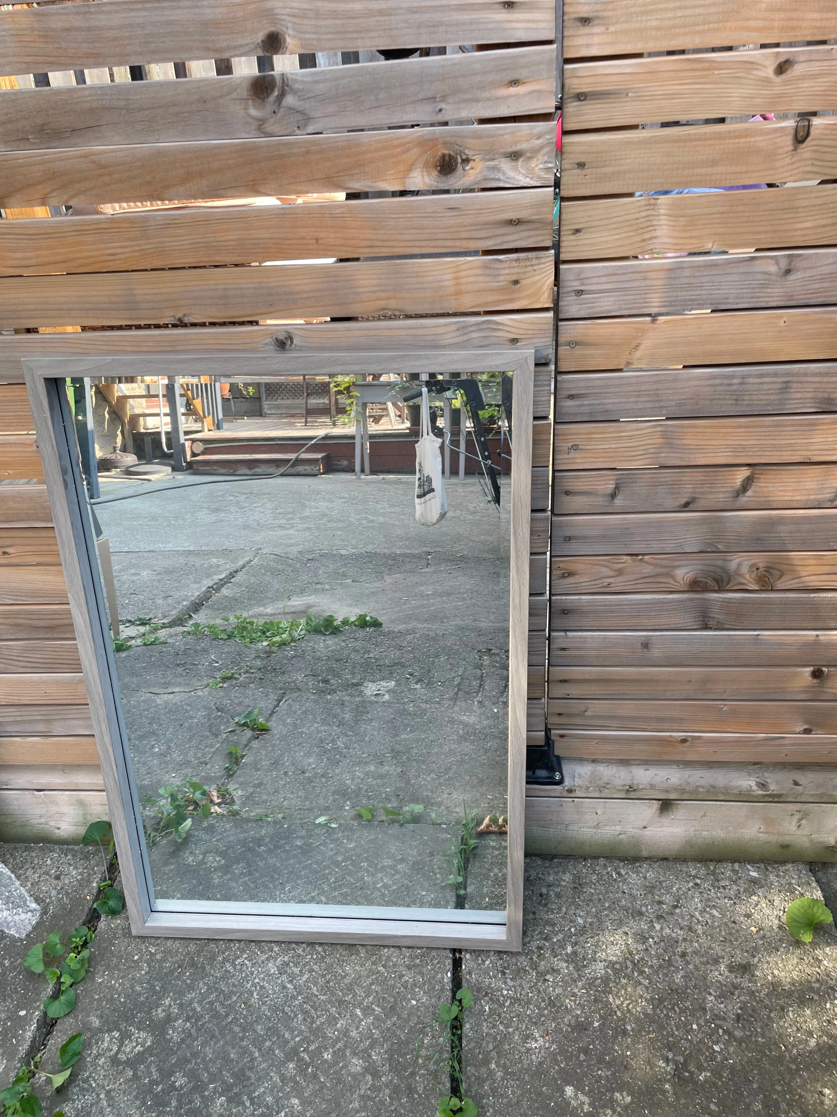 SElling a framed mirror. It has a light-coloured wooden frame. Its in good condition and ready to brighten up your space.