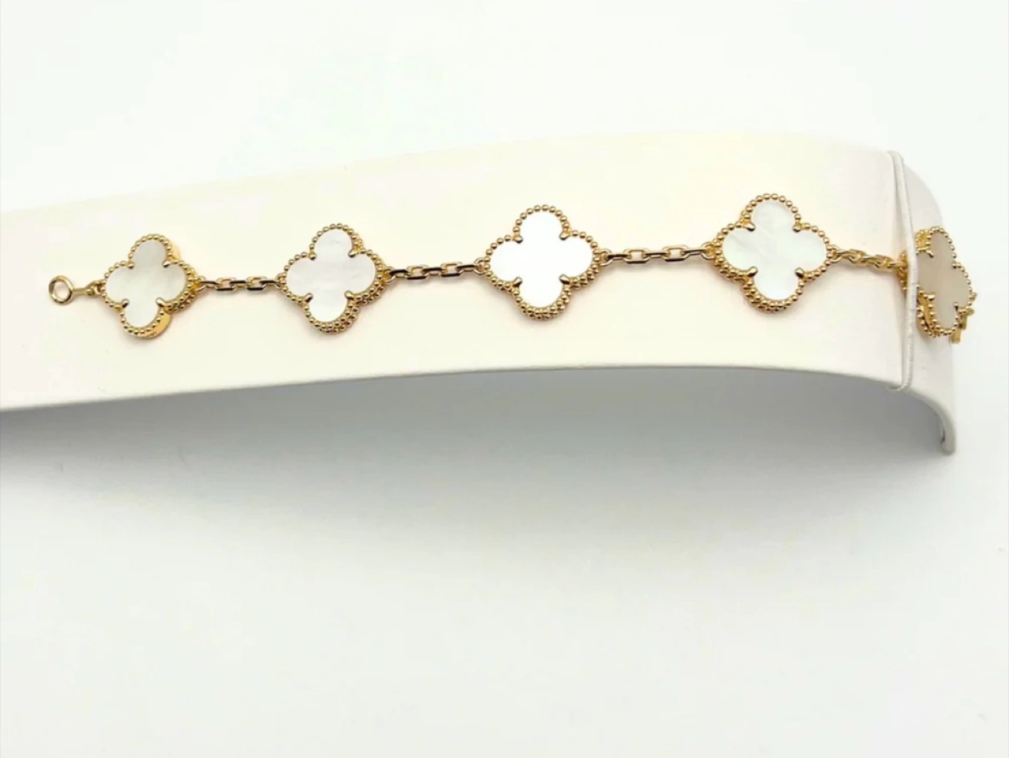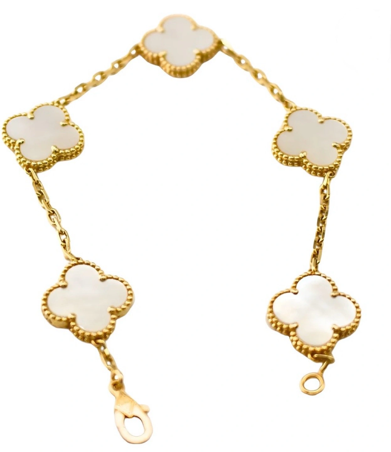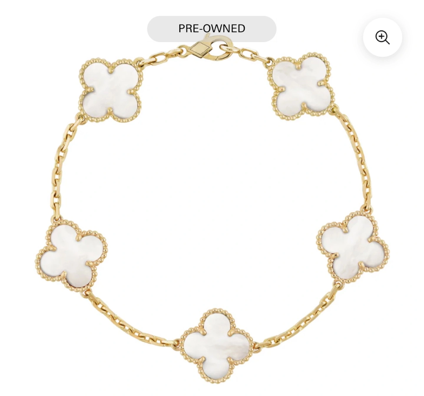 Selling a Van Cleef & Arpels Alhambra bracelet. It features the iconic clover motif with a mother-of-pearl inlay and a delicate gold chain. A timeless piece! This is a pre-owned piece so I’m open to offers