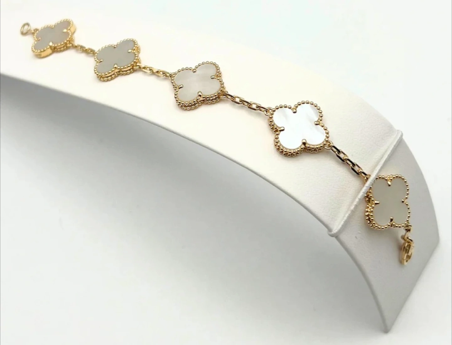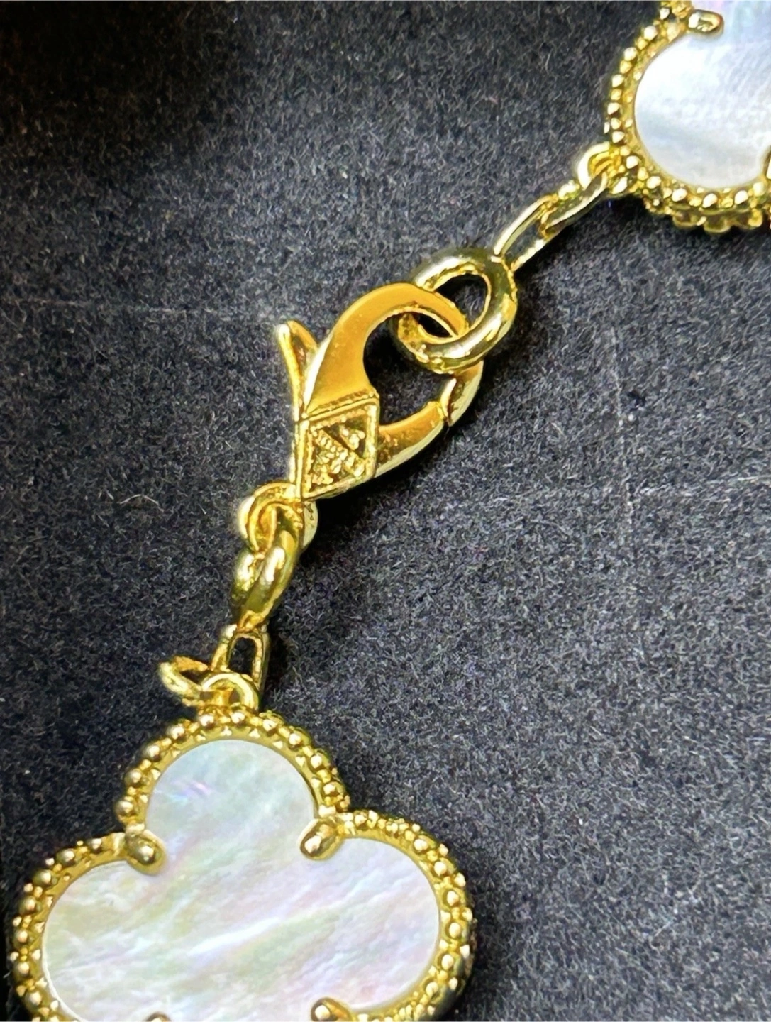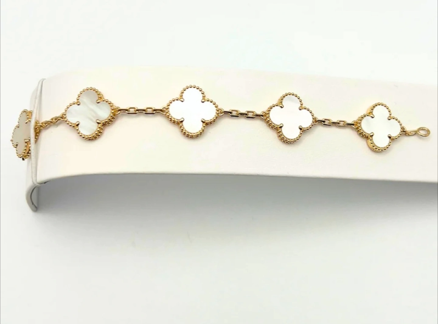 Selling a Van Cleef & Arpels Alhambra bracelet. It features the iconic clover motif with a mother-of-pearl inlay and a delicate gold chain. A timeless piece! This is a pre-owned piece so I’m open to offers