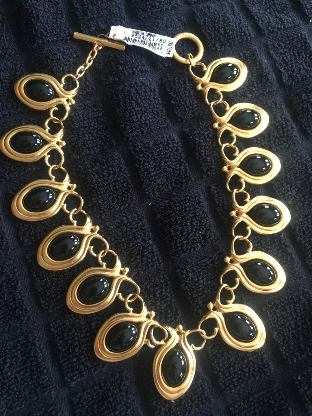 Here's a lovely vintage necklace featuring a gold-tone chain and striking black stones. It's a unique piece that adds a touch of elegance to any outfit. Originally priced at $40.00, it's a great find for vintage jewellery lovers