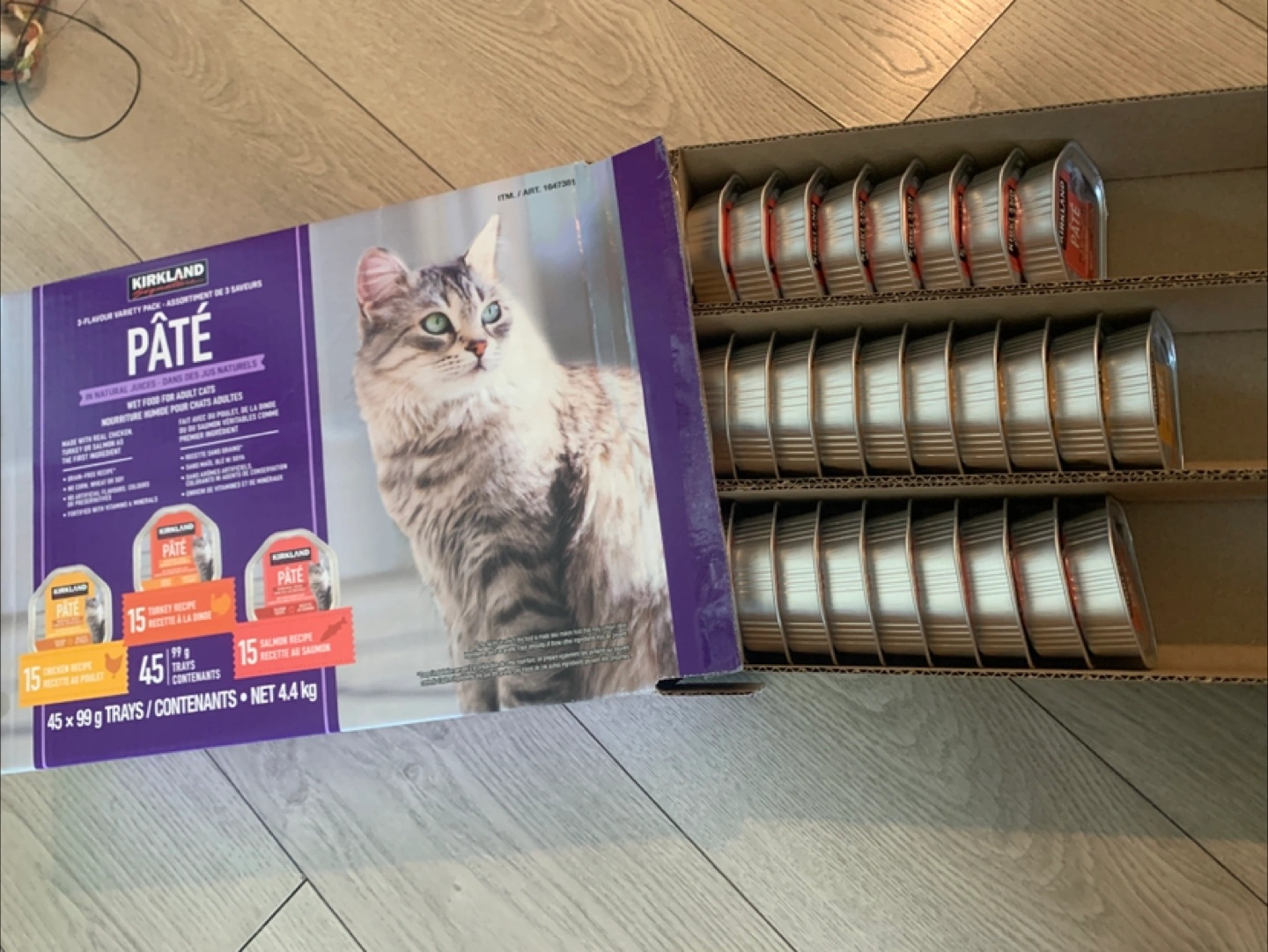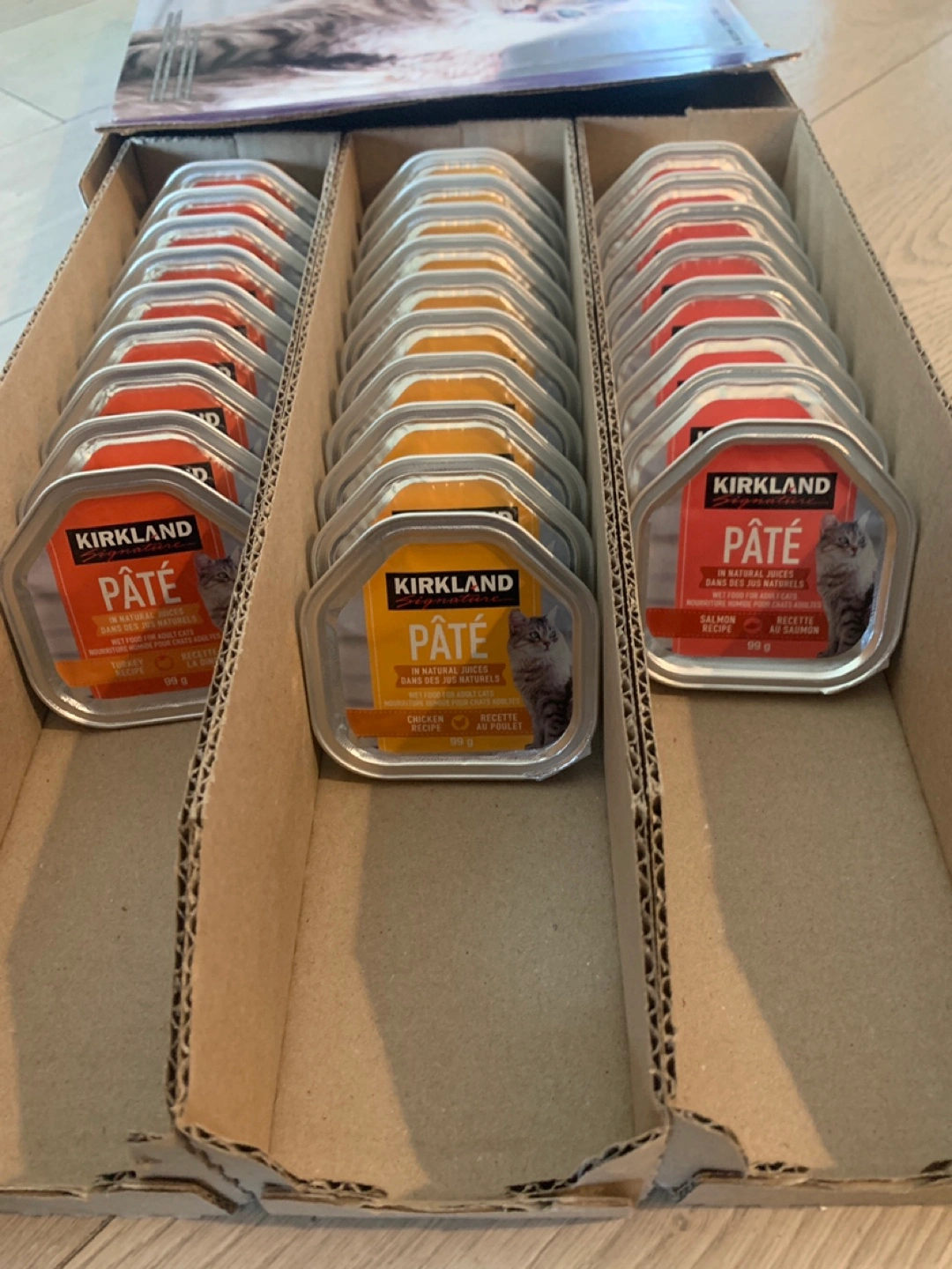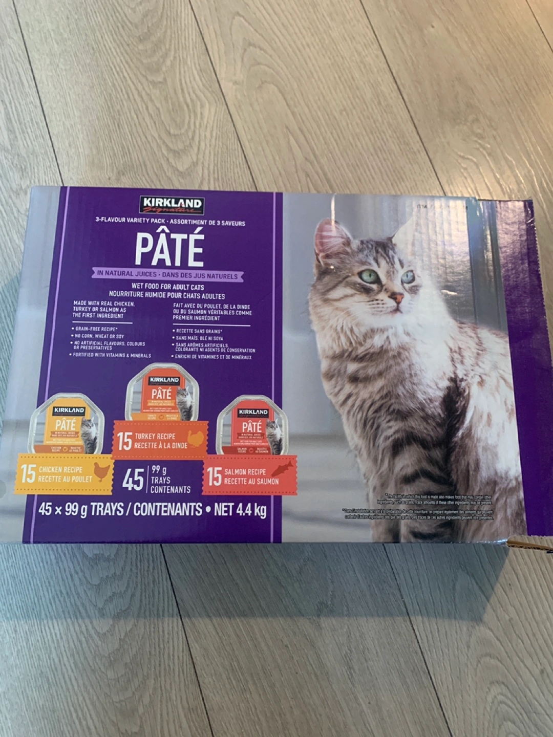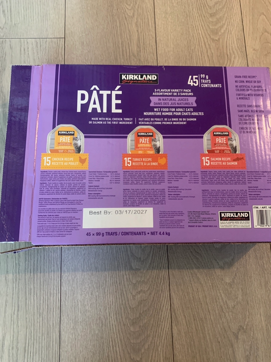 Selling a brand new box of Kirkland Pâté cat food! This is a 3-flavour variety packs. Each tray is 99g. The flavours included are chicken, turkey, and salmon. It's wet food for adult cats, made with real meat as the first ingredient, and is grain-free. Best before March 17, 2027 Selling these because my cats are raw food ratings and a friend of mine gave me all of this since she is leaving the country with her cat. They are still good. Costco sells all of this for $43.99 ——- ‼️NO TRADE‼️✨firm pricing✨ ✨pick up at Wellesley subway station or at my condo building✨will be confirmed once reserved