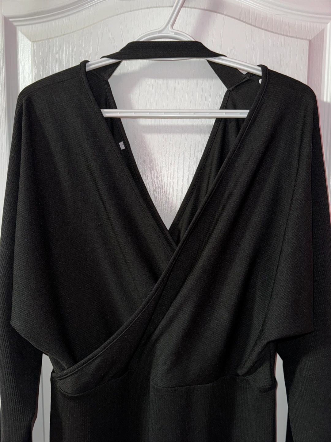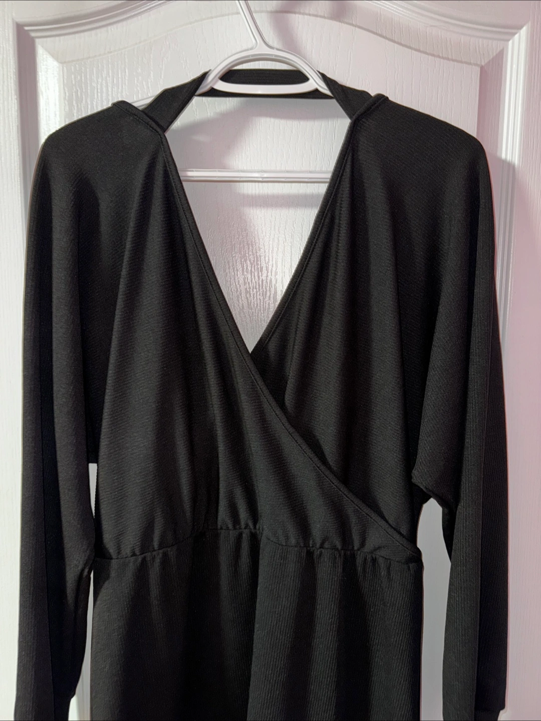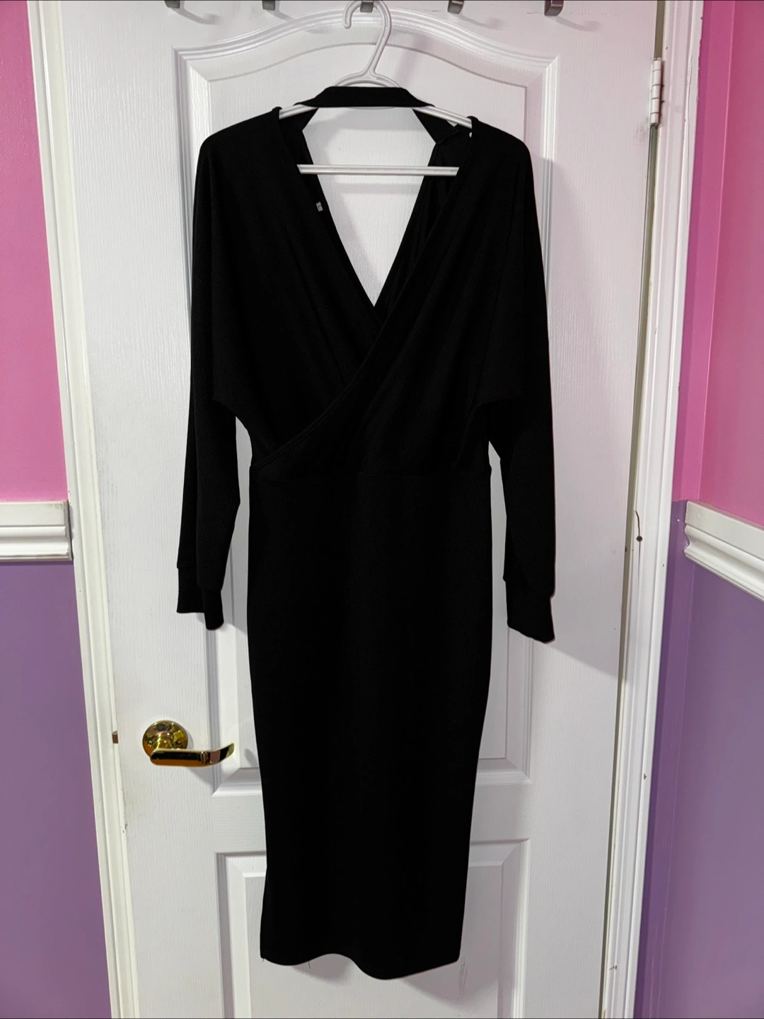 A stylish black wrap midi dress, perfect for a night out or a special occasion. The dress features a flattering V-neckline and long sleeves. It's in great condition and ready for a new home. Size L.