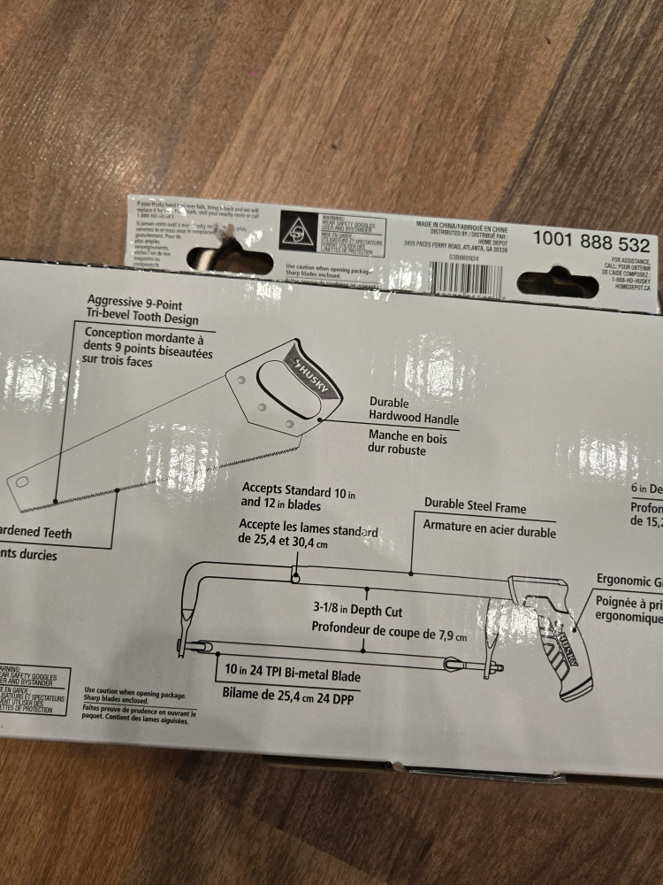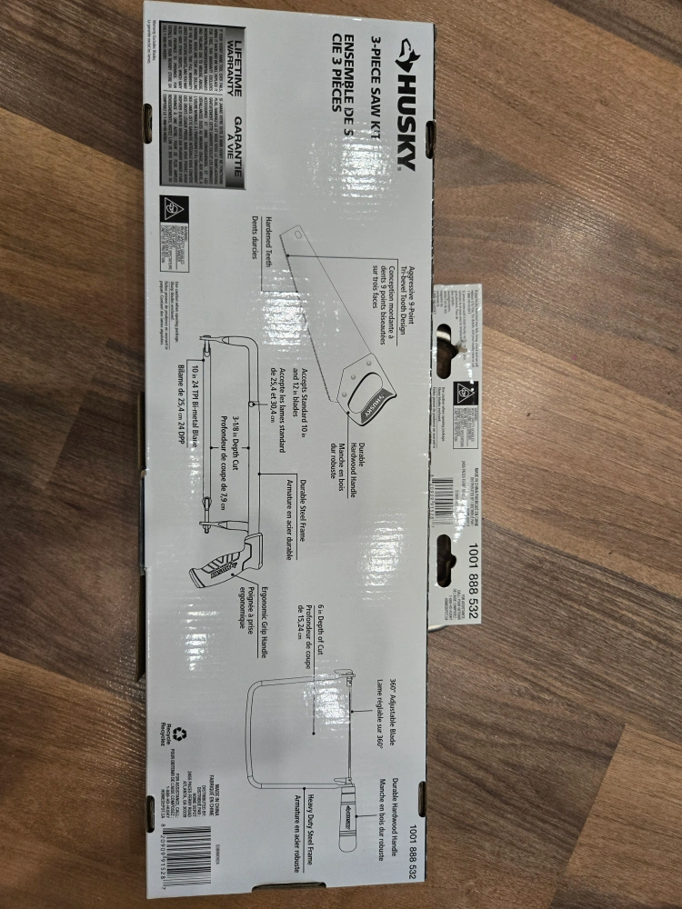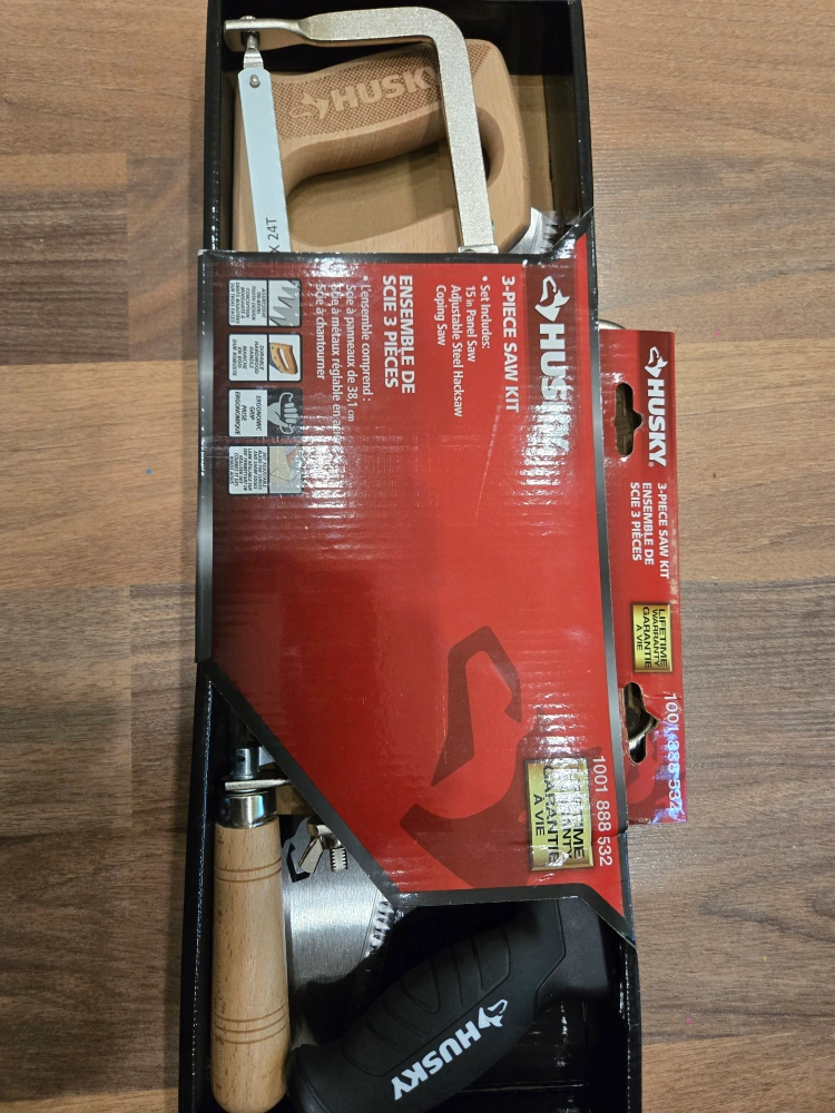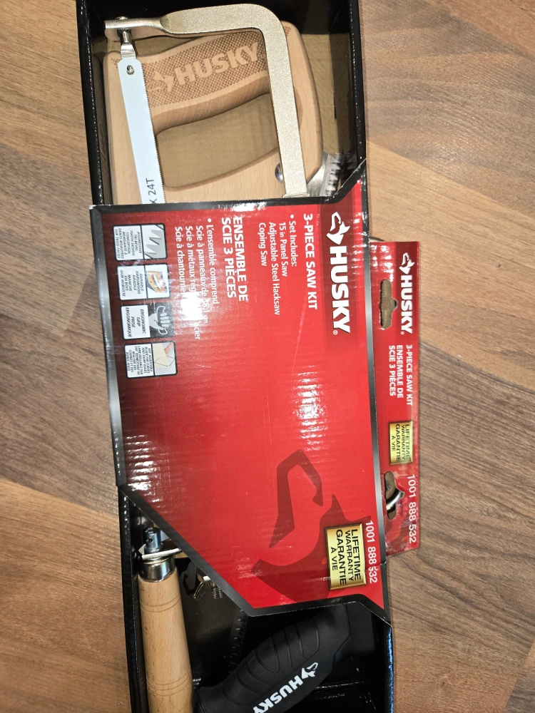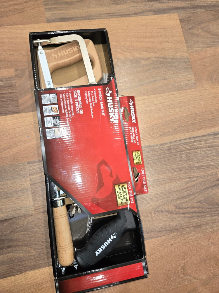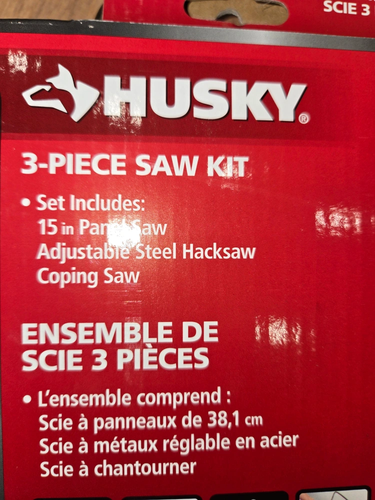 I'm selling a brand new Husky 3-Piece Saw Kit! The set includes a 15-inch Pan Saw, an adjustable steel hacksaw, and a coping saw. It also comes in its original box!