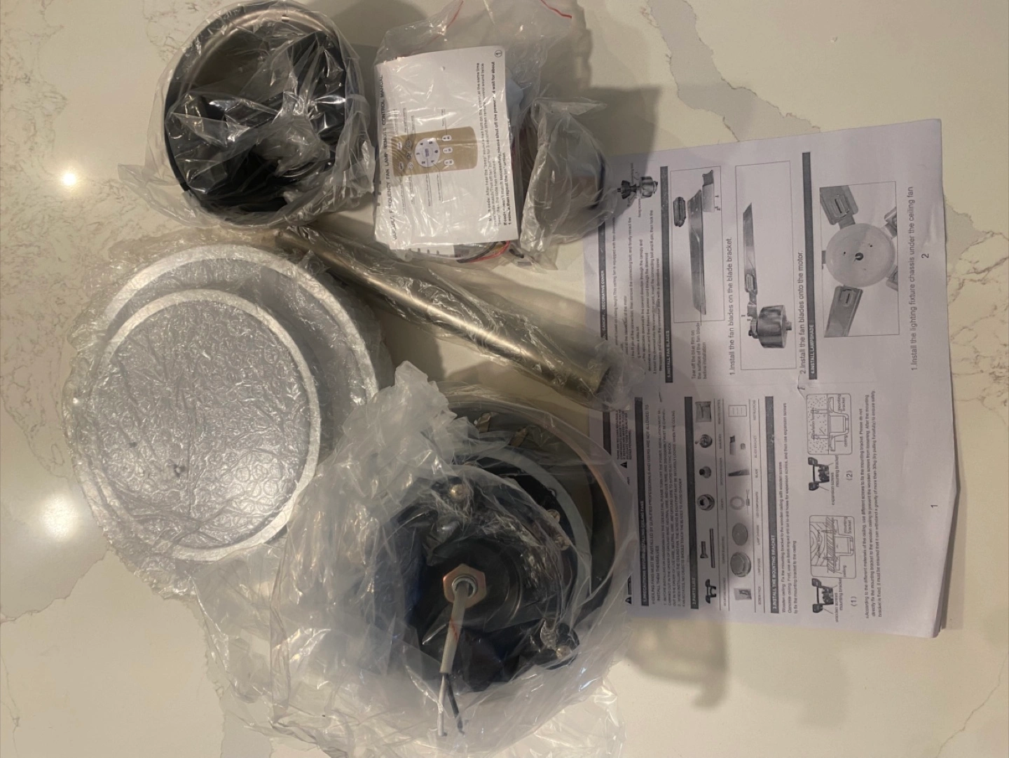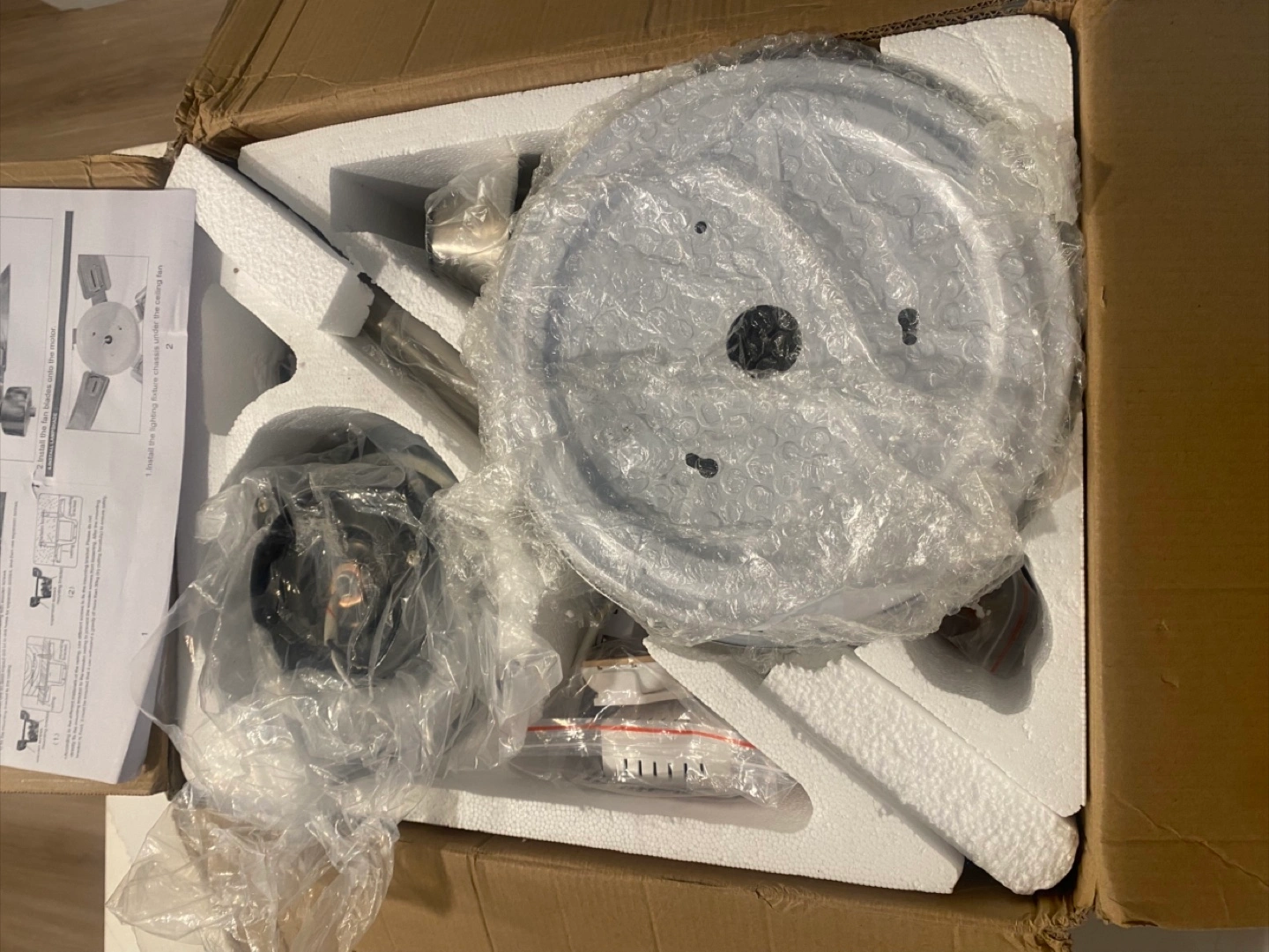 Selling a brand new ceiling fan that comes with a light kit. It's still in the original packaging and hasn't been used. All components and accessories are included, along with the instructions. Perfect for adding a touch of style and functionality to any room!