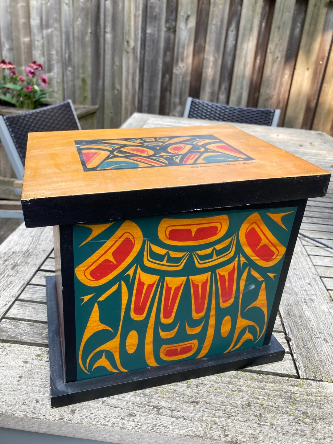 Beautiful Haida art wooden box. Artist is Clarence A. Wells. Perfect piece of art for a den or coffee table. Dimensions: 9.5 x 7 x 8 inches Cash only, please