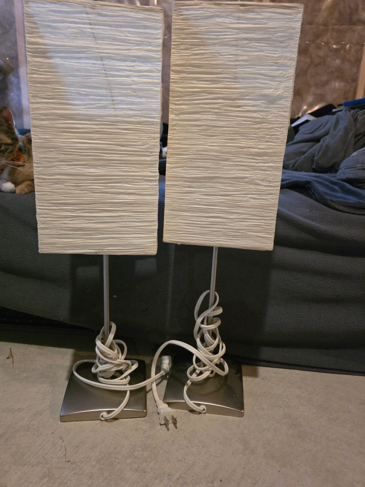 Here's a matching pair of table lamps! They have a square shade and a metal base. They're in great condition and would look great in any room