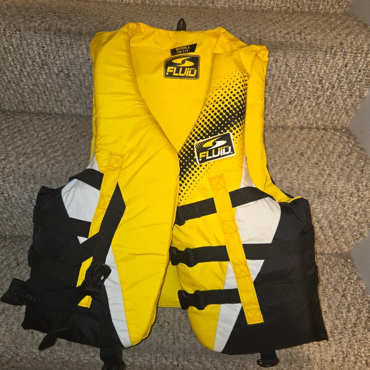 Fluid life jacket in size small/petit. It's designed for chest sizes 84 to 91 cm. Manufactured in 2017, this PFD has rarely been used and kept in a cool, dry location - like new!