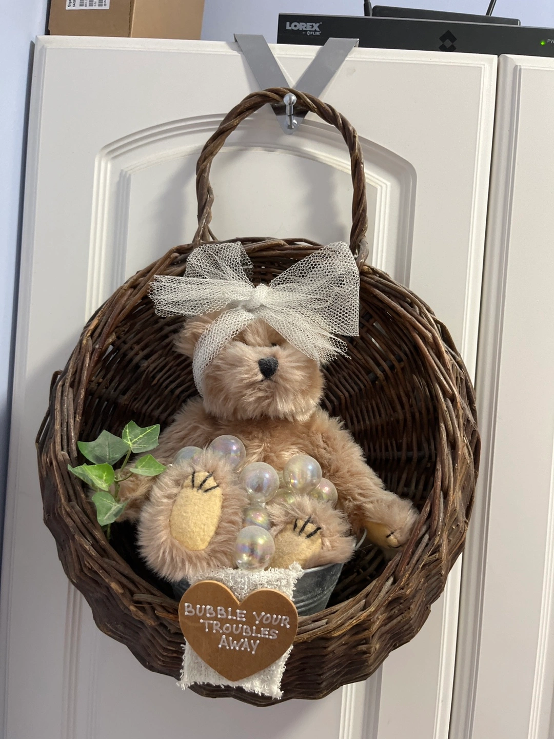This is a cute wicker basket with a teddy bear inside! It has a sign that says "Bubble Your Troubles Away". It would be a great addition to any room!