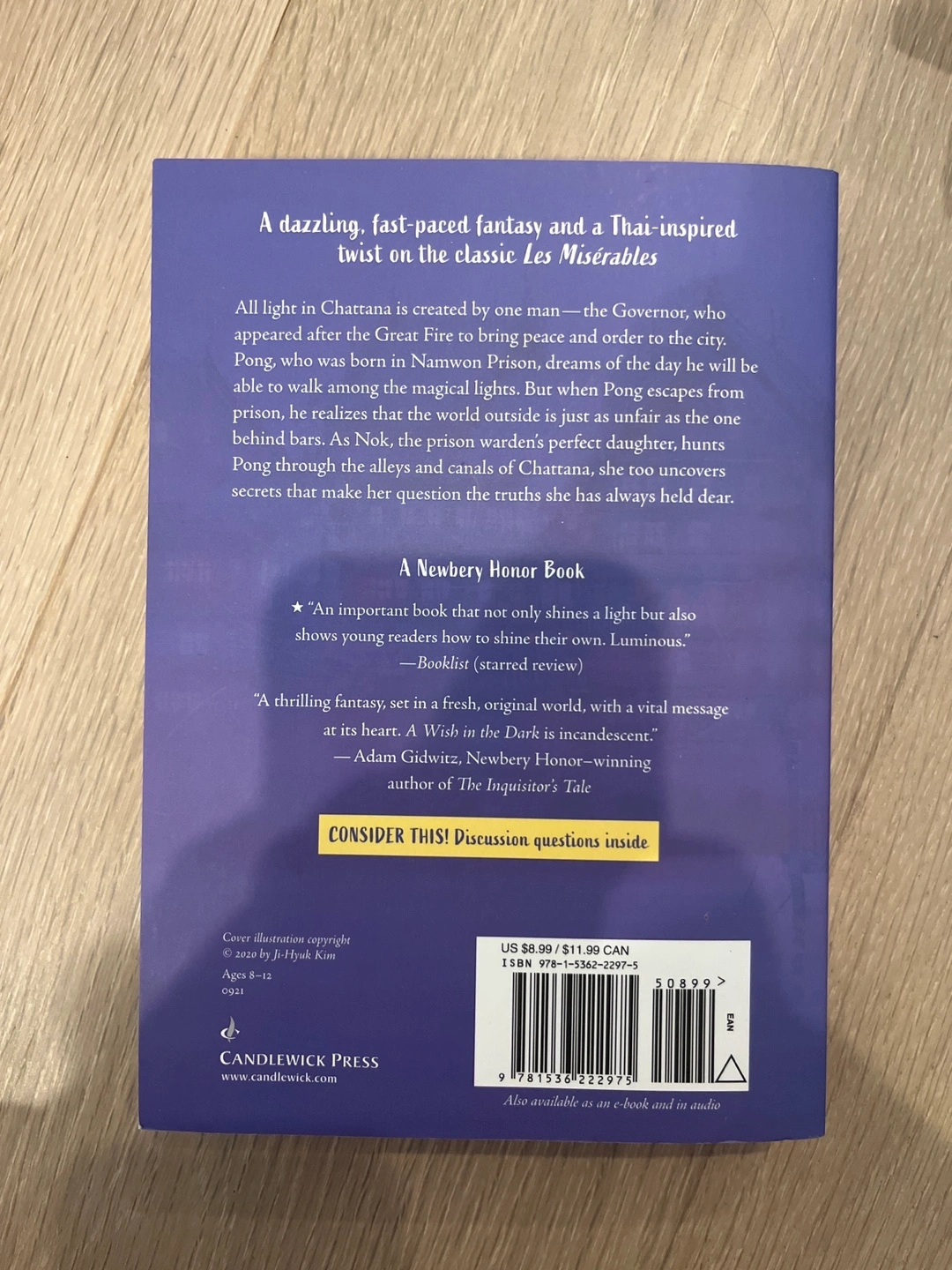 Selling a copy of "A Wish in the Dark" by Christina Soontornvat! It's a dazzling, fast-paced fantasy with a Thai-inspired twist on the classic Les Misérables. A Newbery Honor Book. The book was originally priced at $11.99 CAN