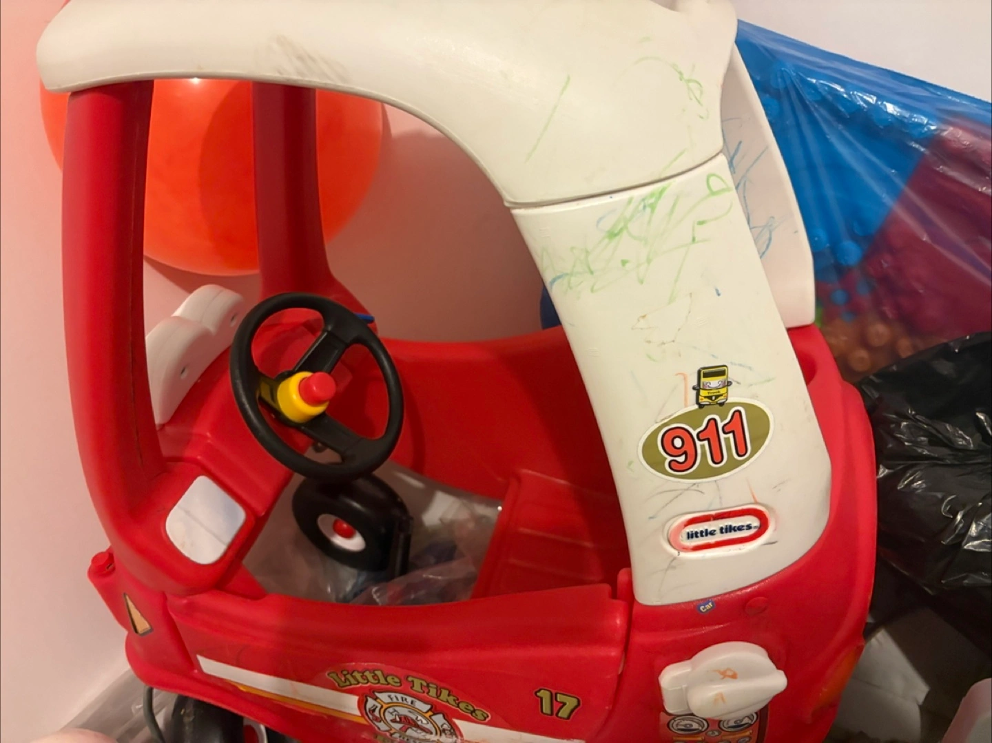 Selling a Little Tikes Cozy Coupe Fire Truck! It's got a fun 911 design and is ready for a new home. It does have some minor cosmetic wear, like some scribbles, but it's still lots of fun for kids to play with!