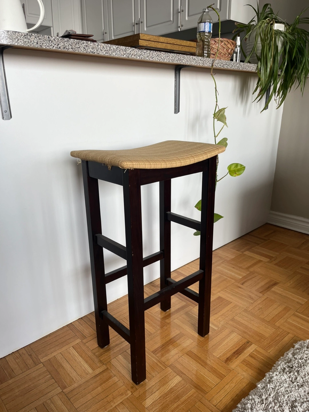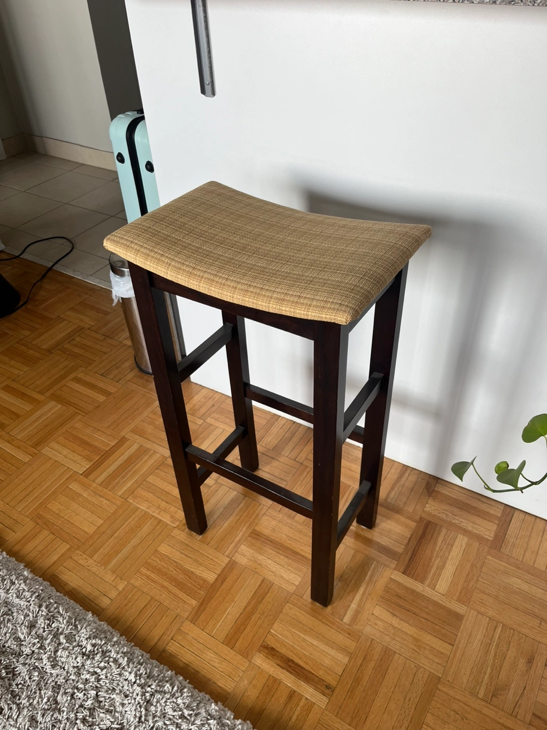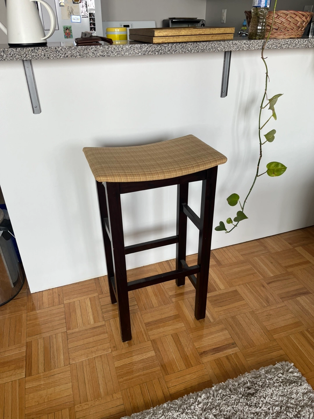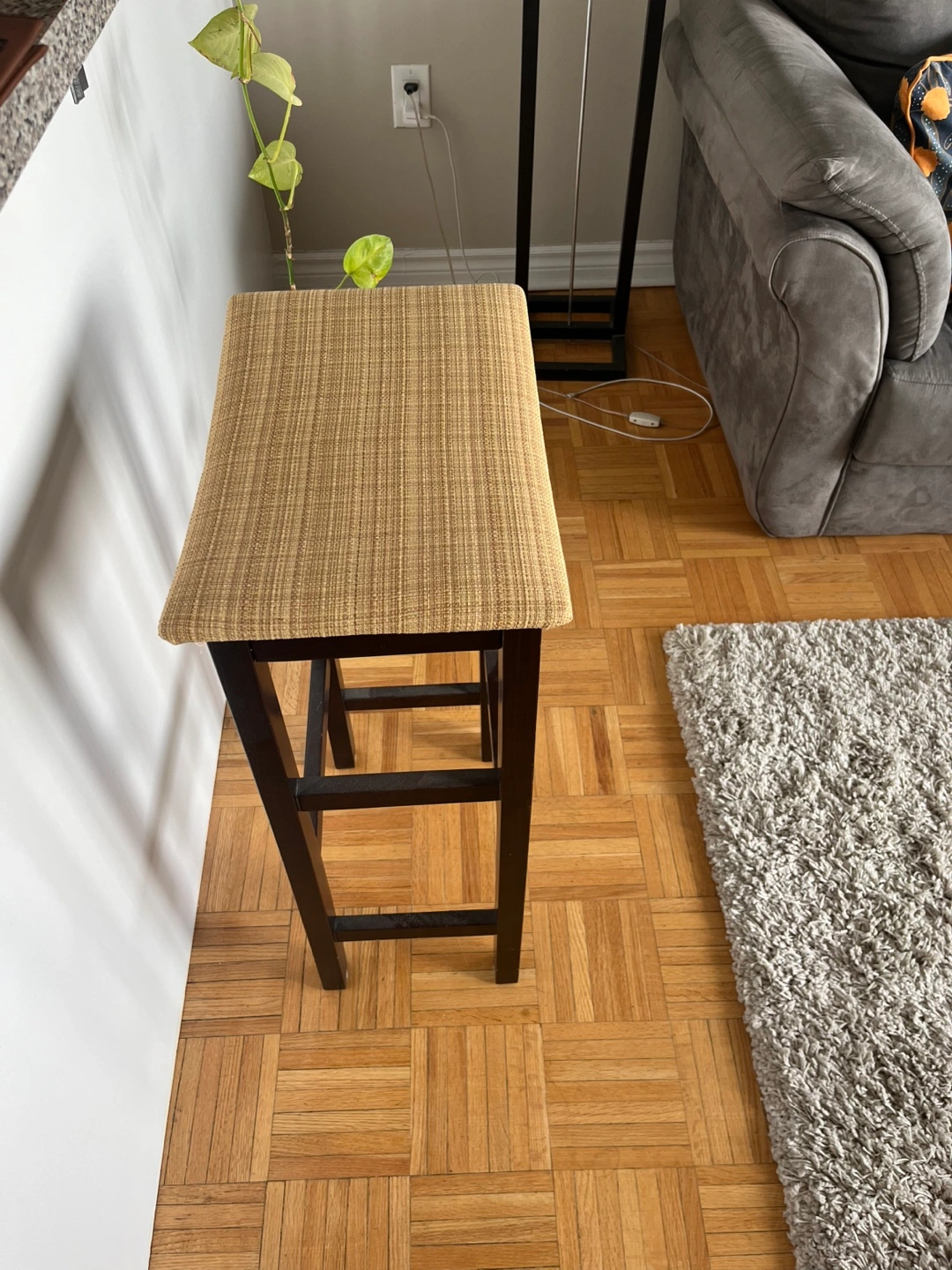 30 height x 17 length x 11 width inches A really stylish and minimalist stool. Will match well with other wooden or brown furnishings. Sad to part with it but I don’t have space at my new place. Not heavy and can be carried by 1 person.