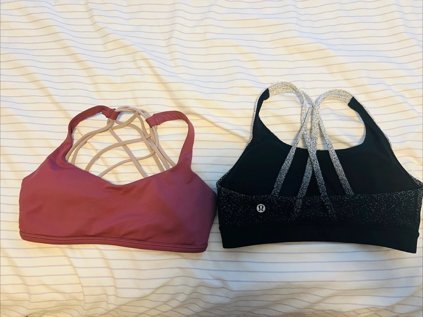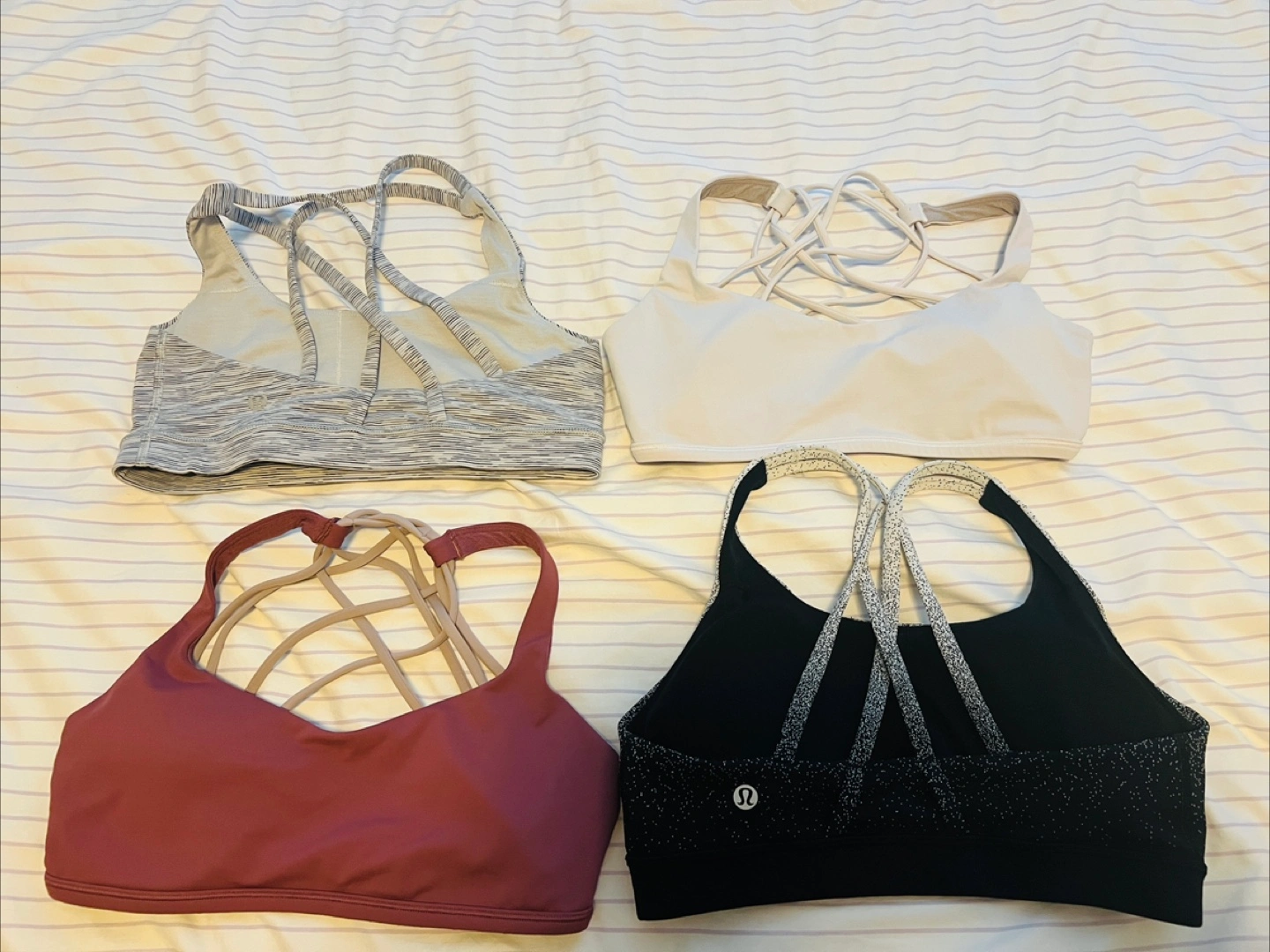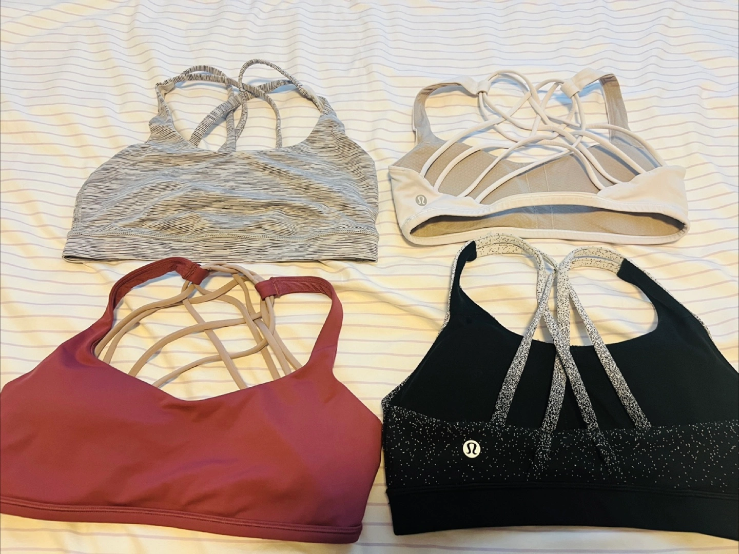 a collection of Lululemon sports bras in various styles and colours. medium and small size. They're all in great condition and ready for a new home! Perfect for yoga, running, or just everyday wear. Feel free to ask any questions!