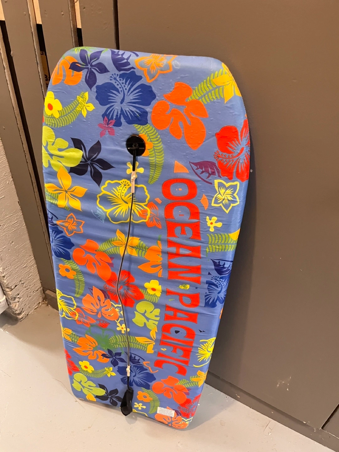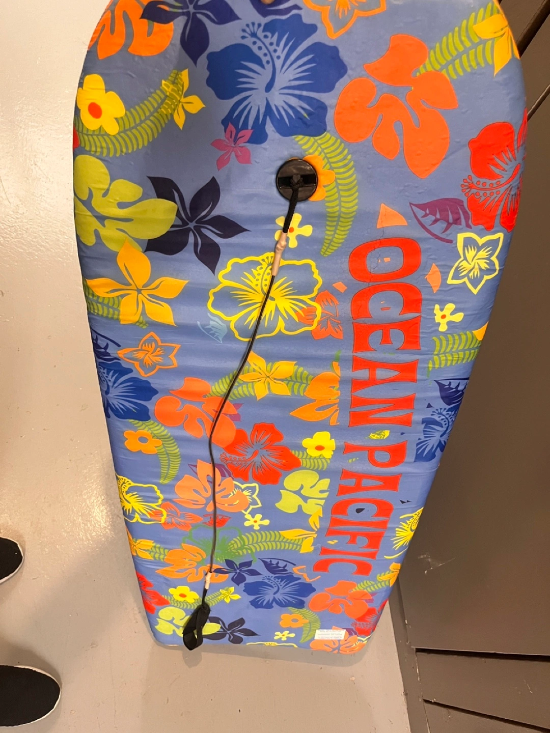 Selling a colourful Ocean Pacific bodyboard with a fun floral design! It's in good condition and ready for some fun in the waves. Perfect for beginners or anyone looking to enjoy some time at the beach this summer