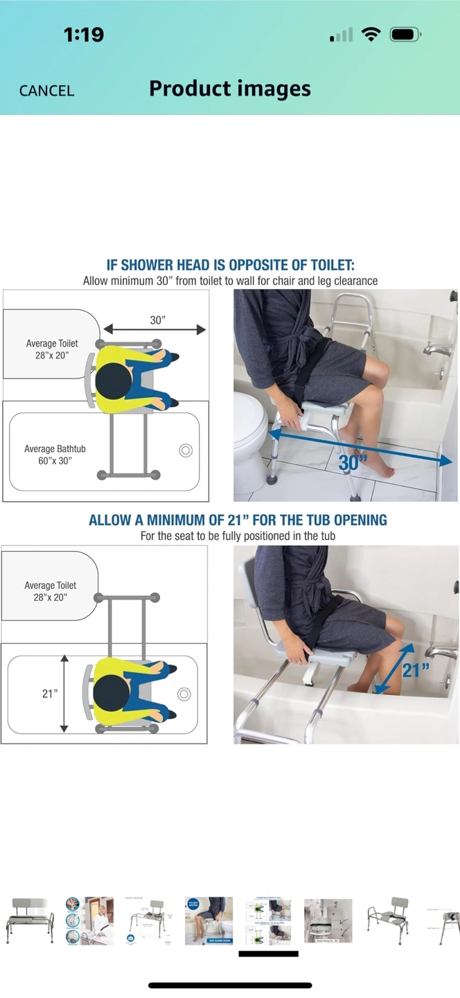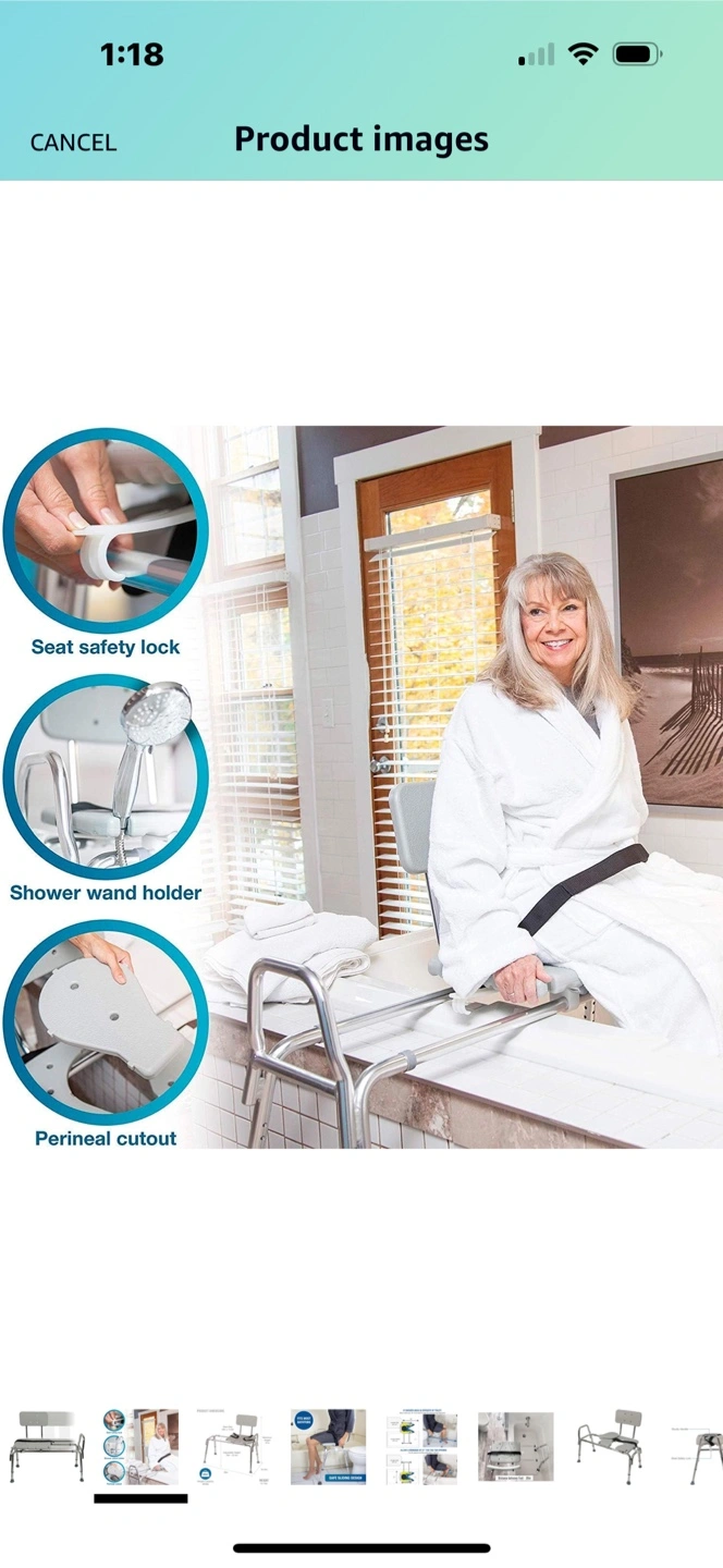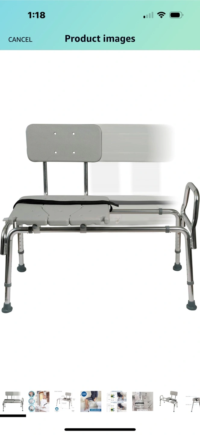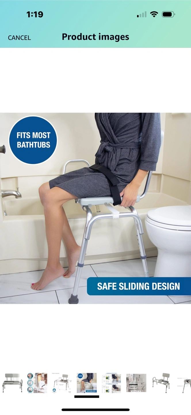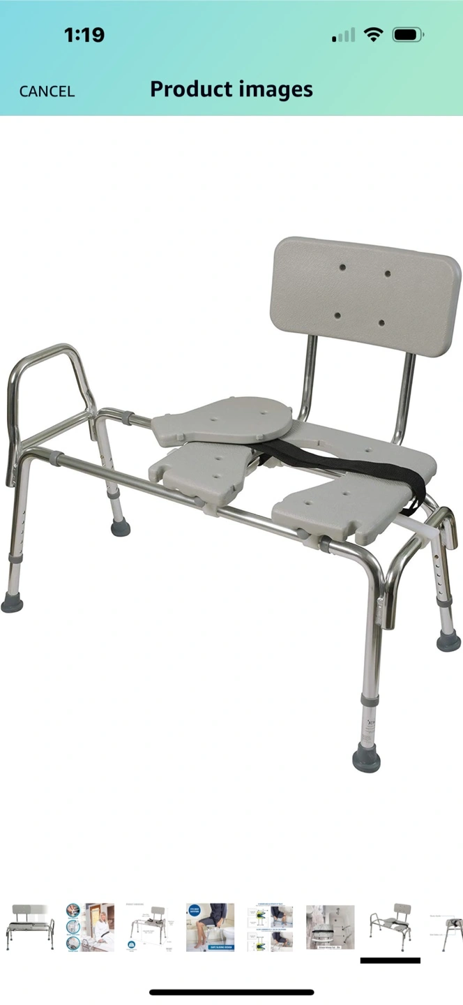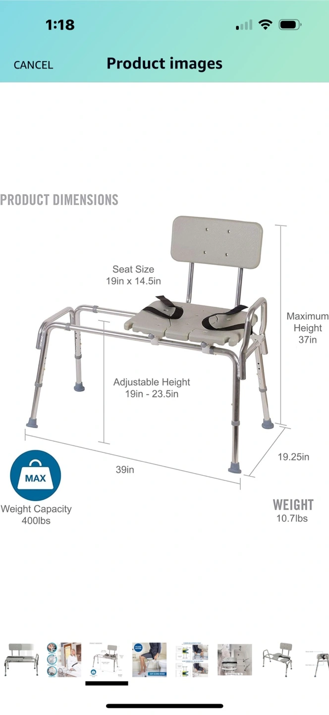 This sliding transfer bench with swivel seat is designed to fit most bathtubs. It has a safe sliding design and a seat safety lock. The seat size is 19in x 14.5in, adjustable height from 19in to 23.5in, and the overall dimensions are 39in in length and 37in in maximum height. It's lightweight at 10.7lbs and can support up to 400lbs. It also includes a shower wand holder and a perineal cutout for added convenience