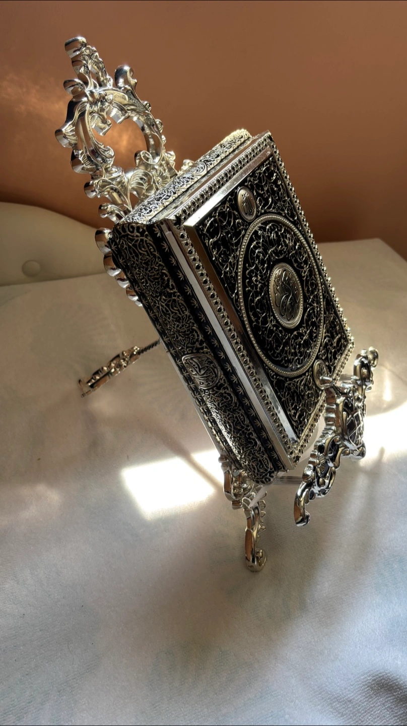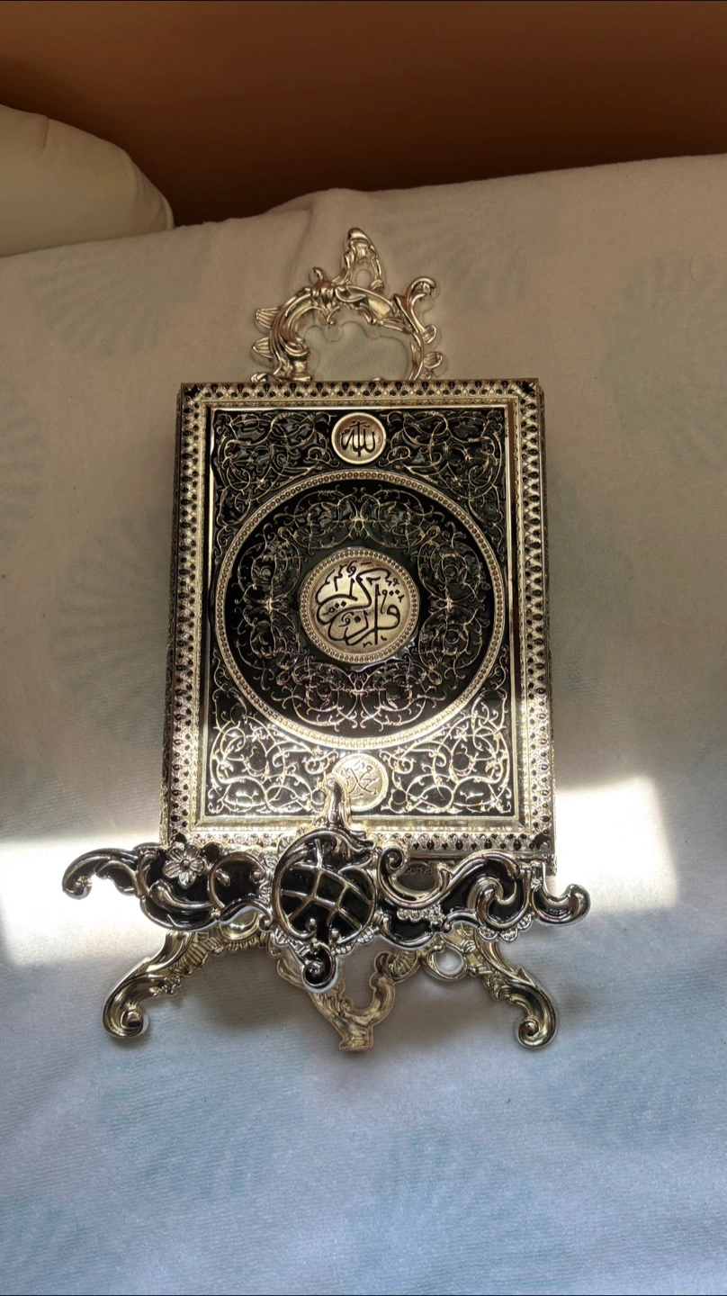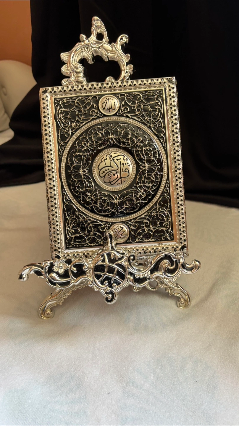 Selling a beautiful ornate decorative Quran stand. It features intricate silver detailing and a black background.