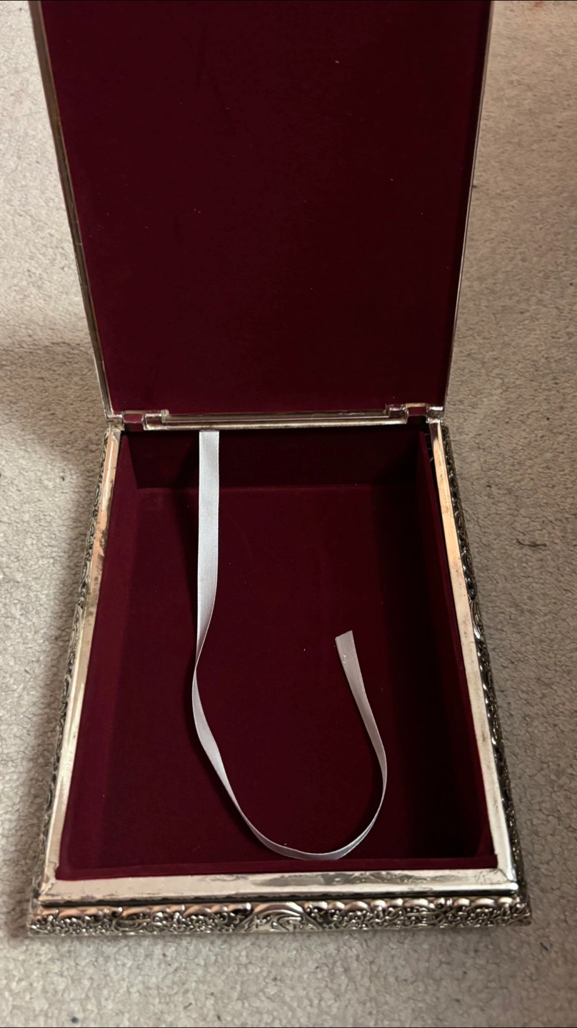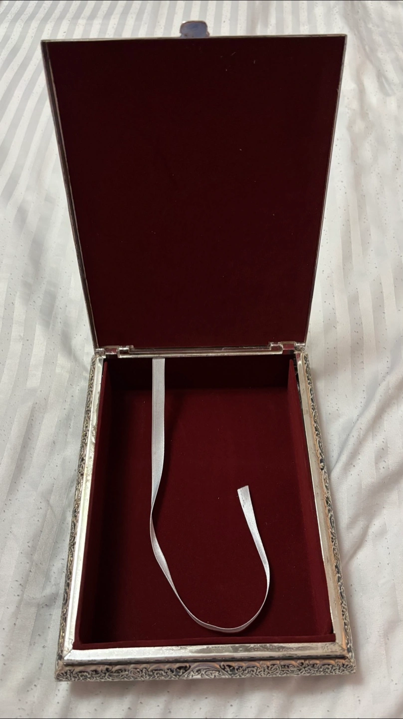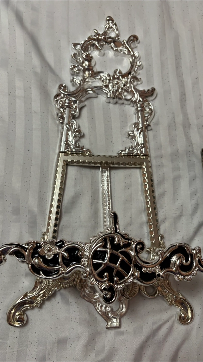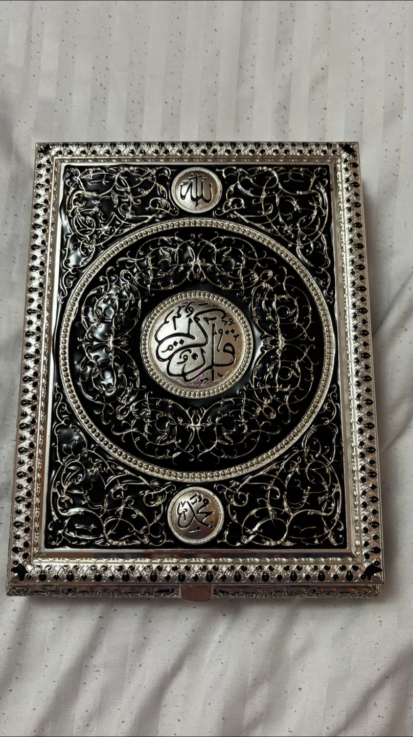 Selling a beautiful ornate decorative Quran stand. It features intricate silver detailing and a black background.