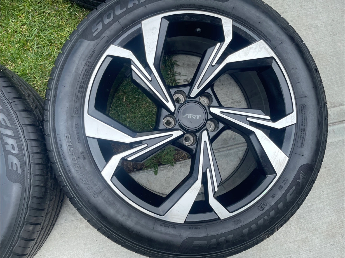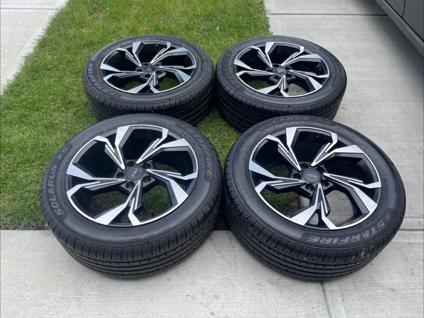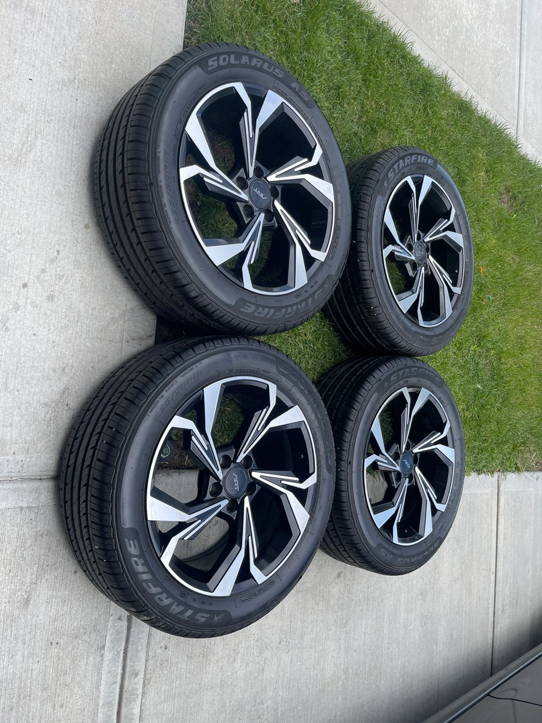 Selling a set of four Kia tires mounted on ART rims. The tires are size 235/50R18 and are Solarus AS Starfire tires. They are in good condition and ready to be installed on your vehicle!
