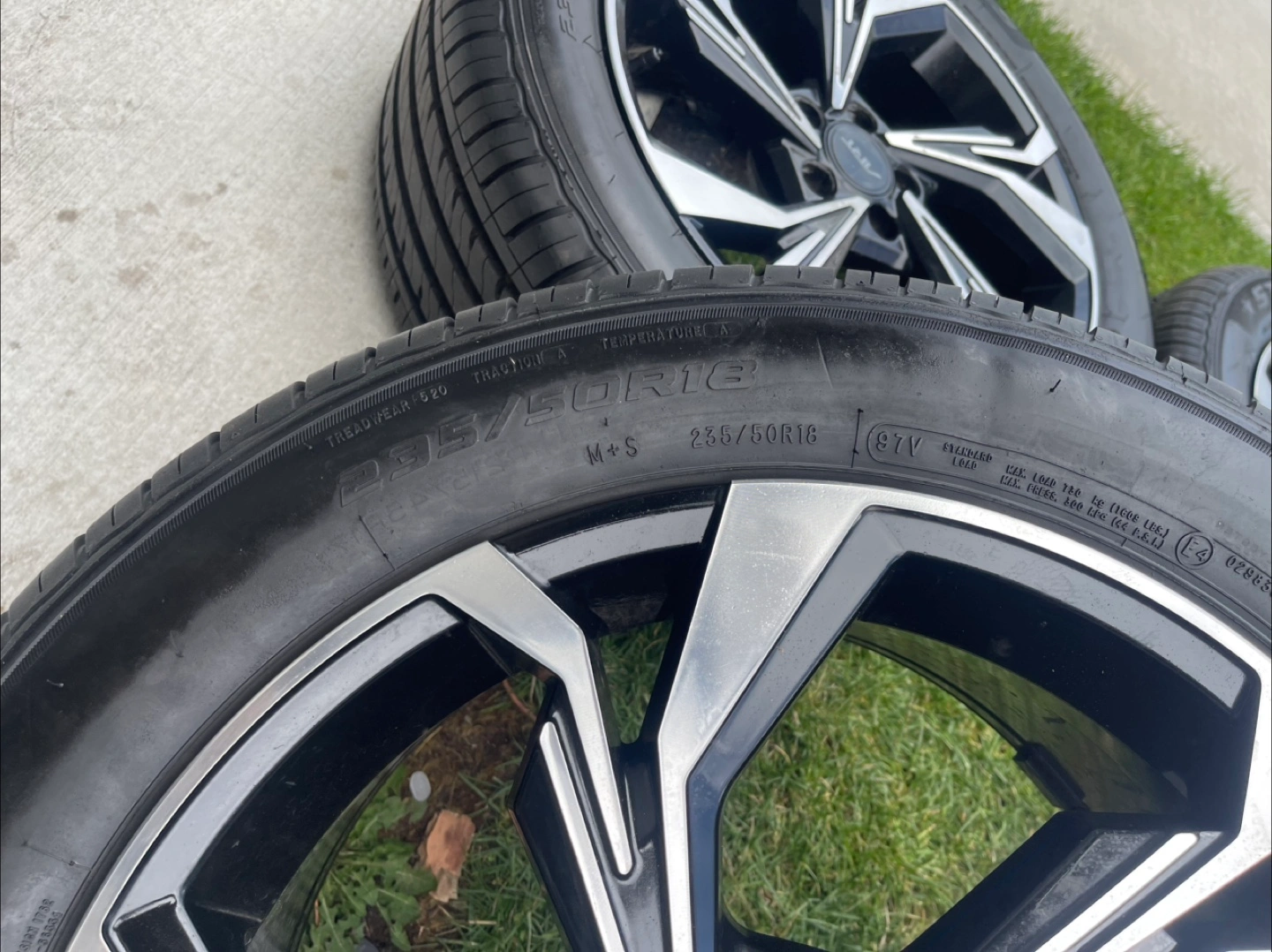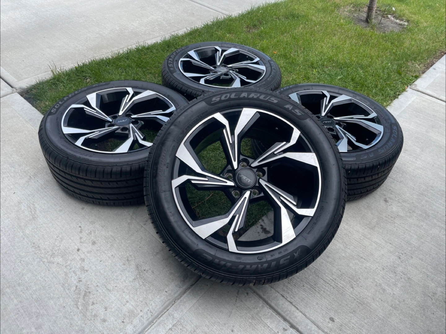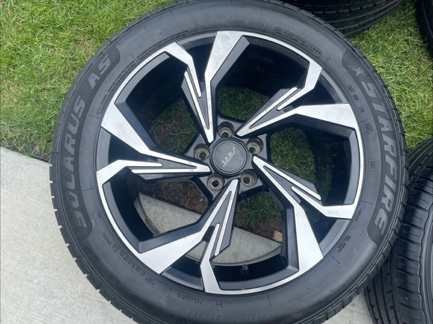 Selling a set of four Kia tires mounted on ART rims. The tires are size 235/50R18 and are Solarus AS Starfire tires. They are in good condition and ready to be installed on your vehicle!