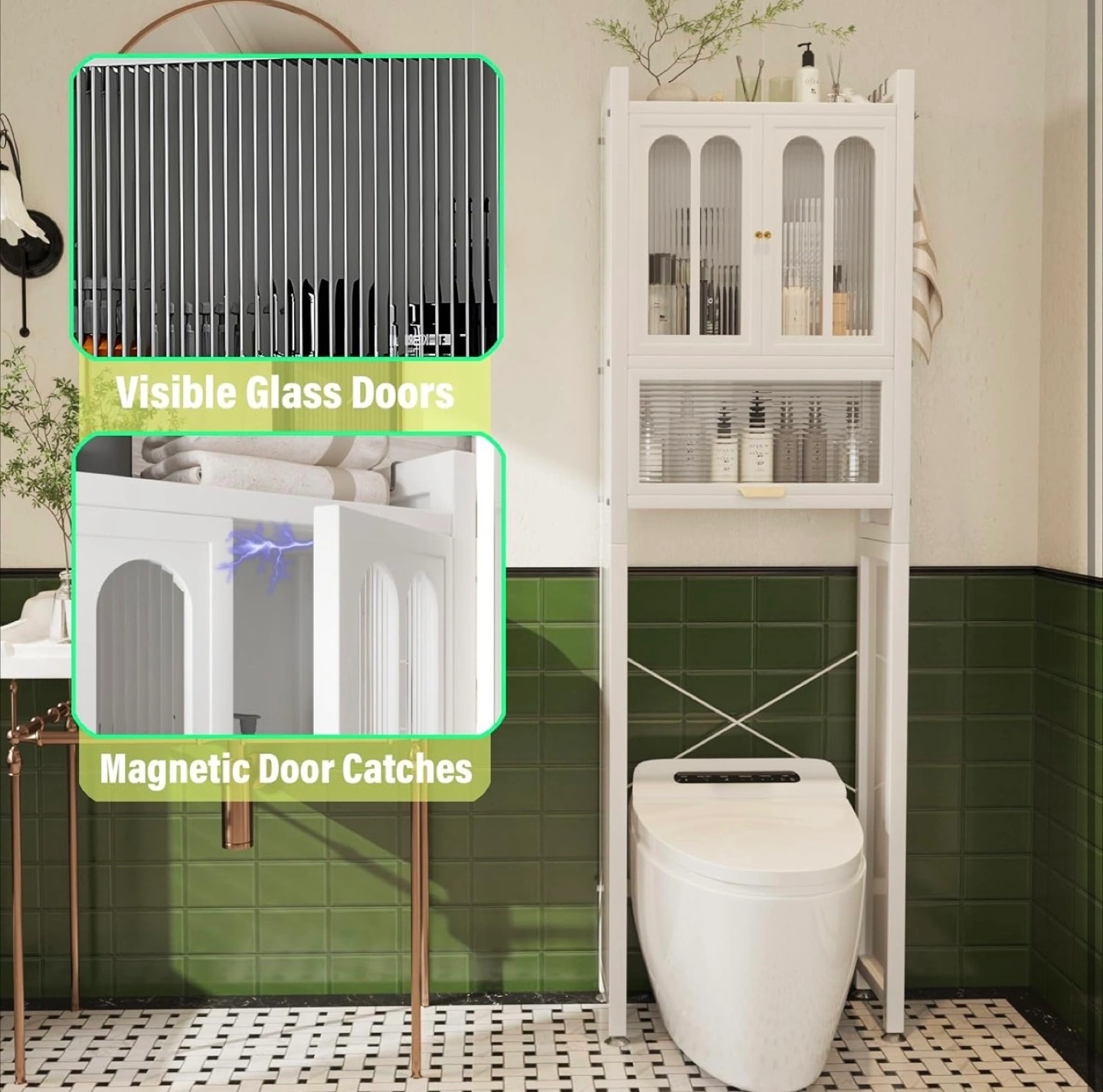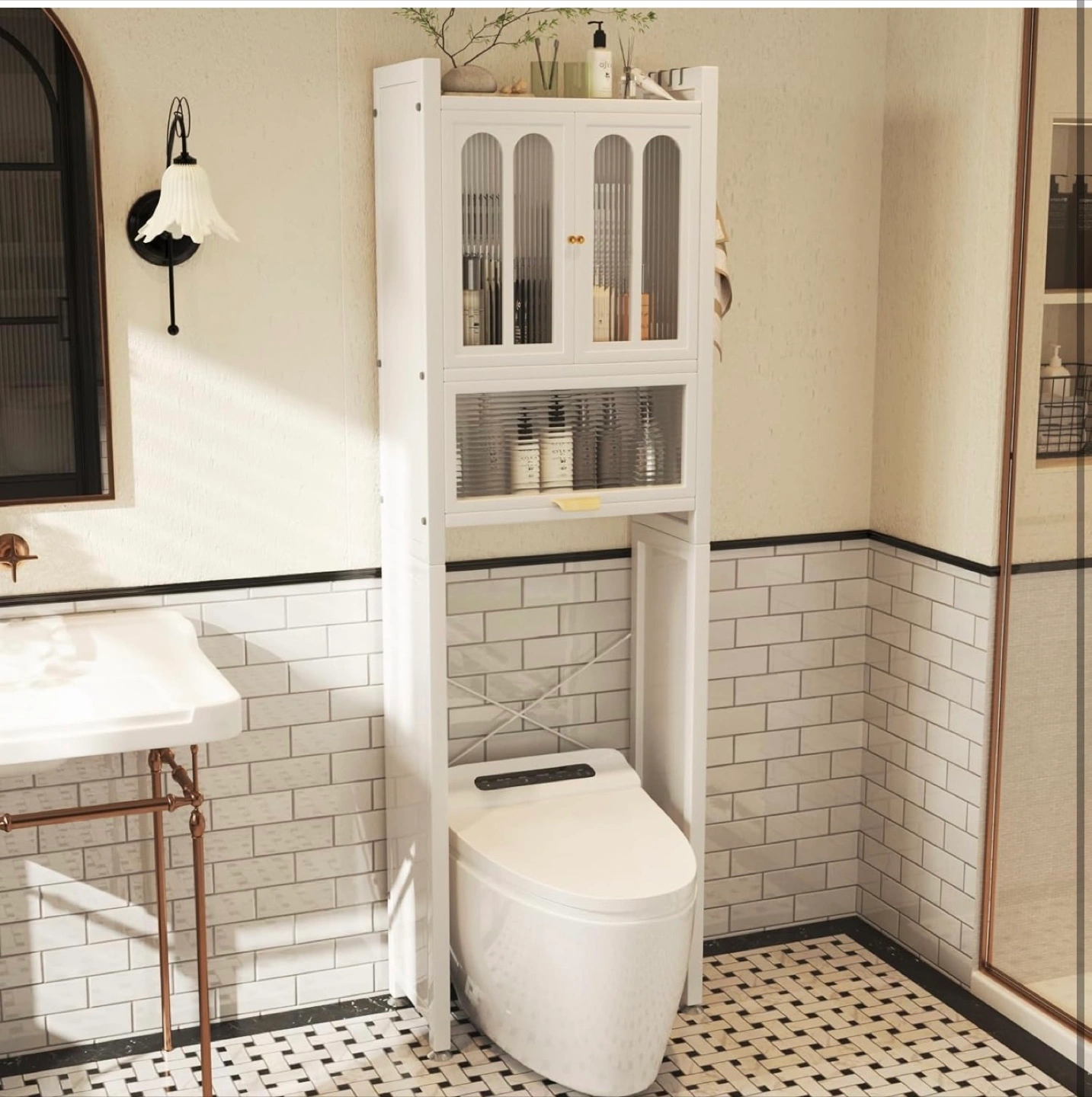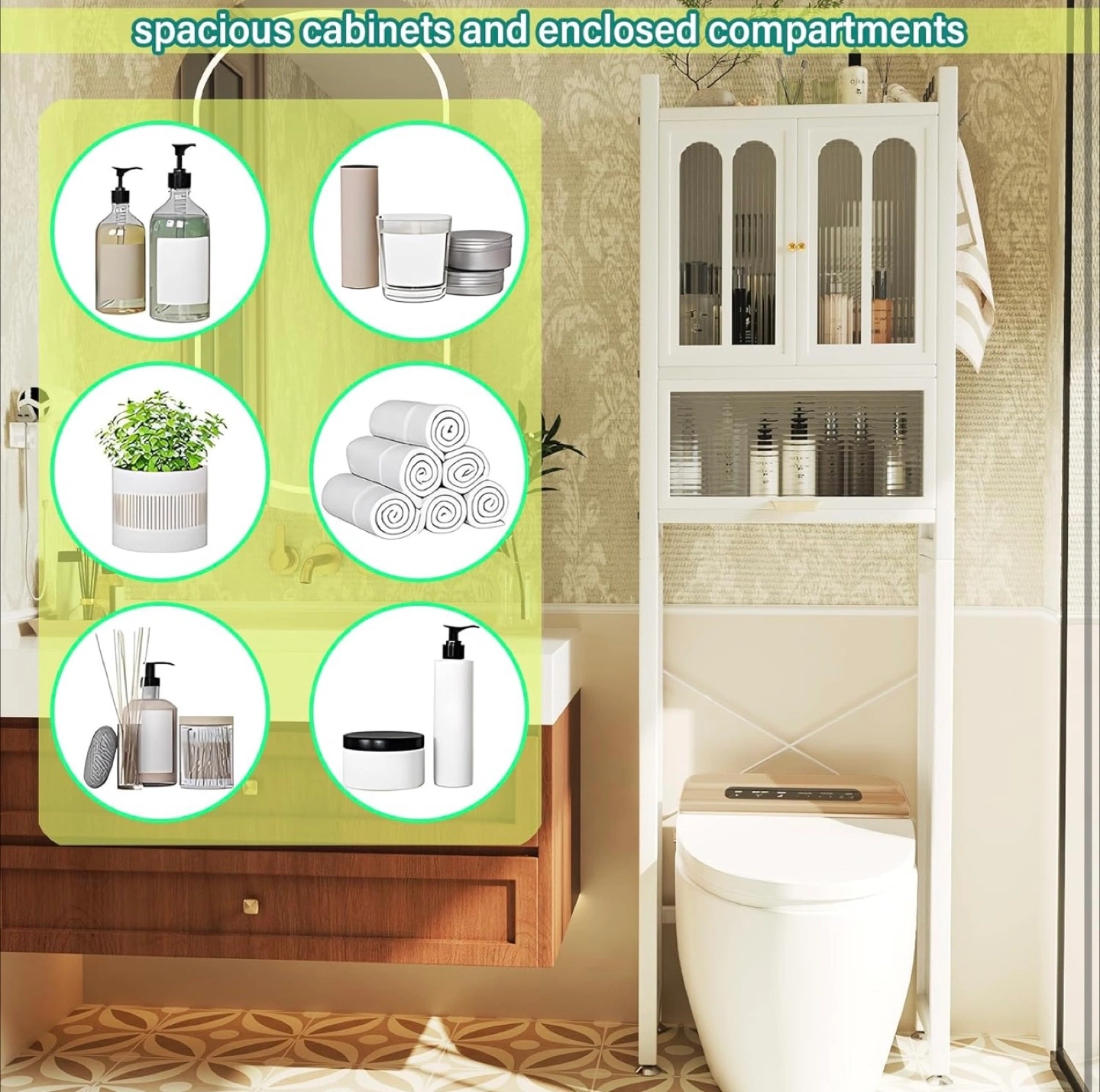 brand new inbox Retails for ($130) Barlezy Metal Over The Toilet Storage Shelf, Free Standing Over The Toilet Storage Cabinet w/Double Visible Doors & One Enclosed Cabinet, Bathroom Rack Organizer Over Toilet with 6 Hooks, White