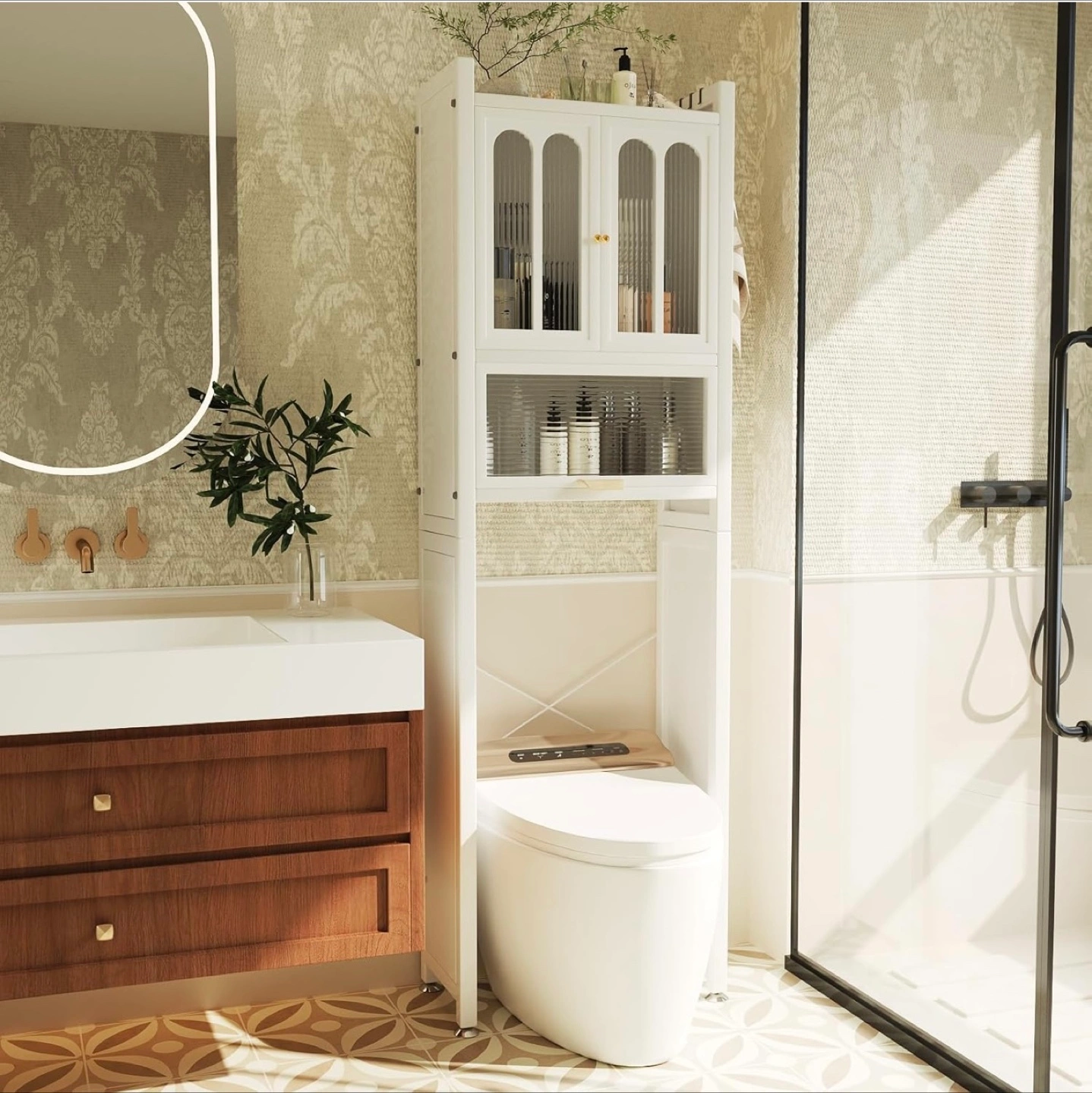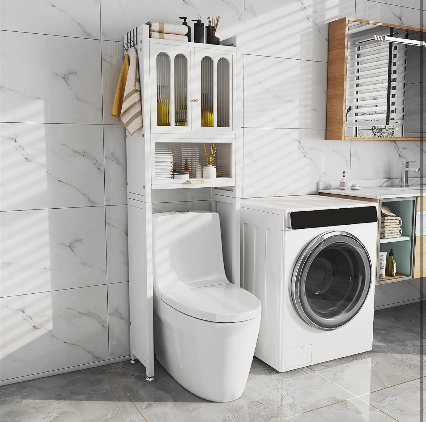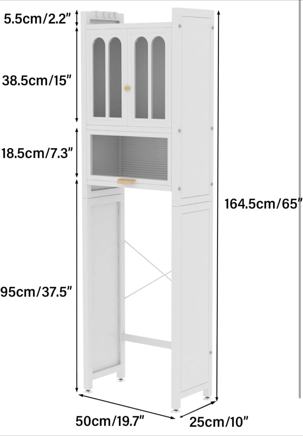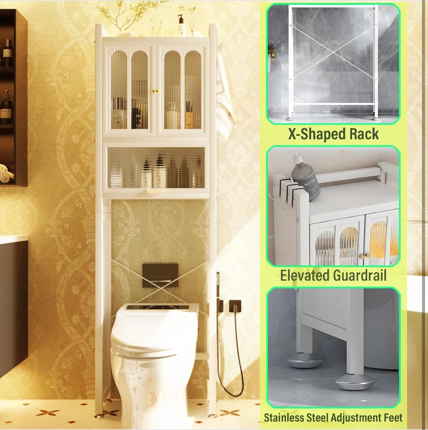 brand new inbox Retails for ($130) Barlezy Metal Over The Toilet Storage Shelf, Free Standing Over The Toilet Storage Cabinet w/Double Visible Doors & One Enclosed Cabinet, Bathroom Rack Organizer Over Toilet with 6 Hooks, White