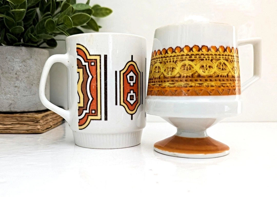 One ceramic pedestal coffee mug. Fabulous unique shape with retro colour and design. Measures approximately 4 inches in height and holds 8 fluid ounces. Made in Japan. One retro ceramic coffee mug. Orange, yellow and brown geometric design. Holds 8 fluid ounces. Measures 4 inches in height and 3 inches in diameter. Mild surface abrasions. Overall, in good vintage condition. Excellent bohemian vibe. ๐ PICK UP TOWNLINE HWY 2 AREA ๐ CASH preferred please ๐