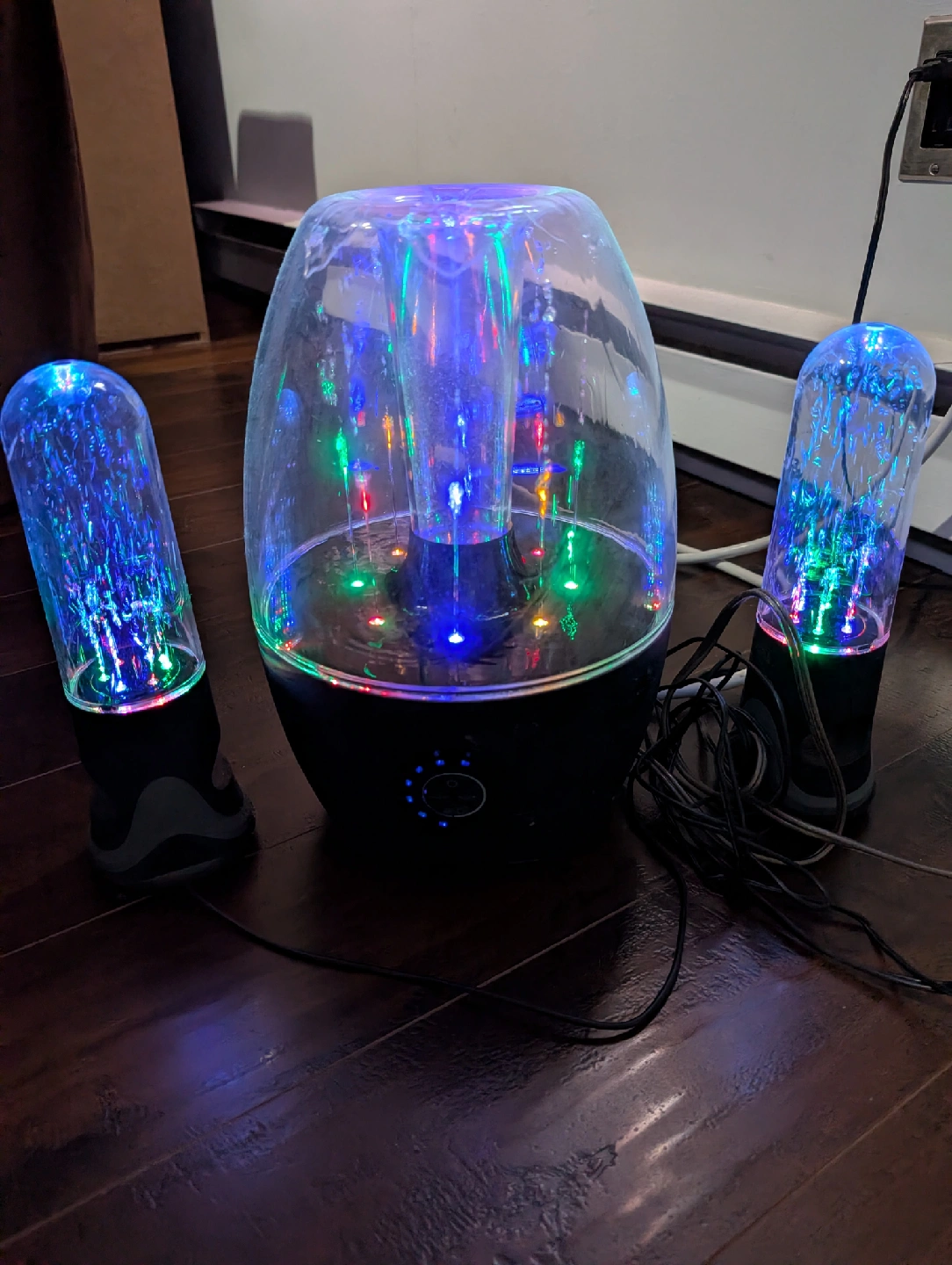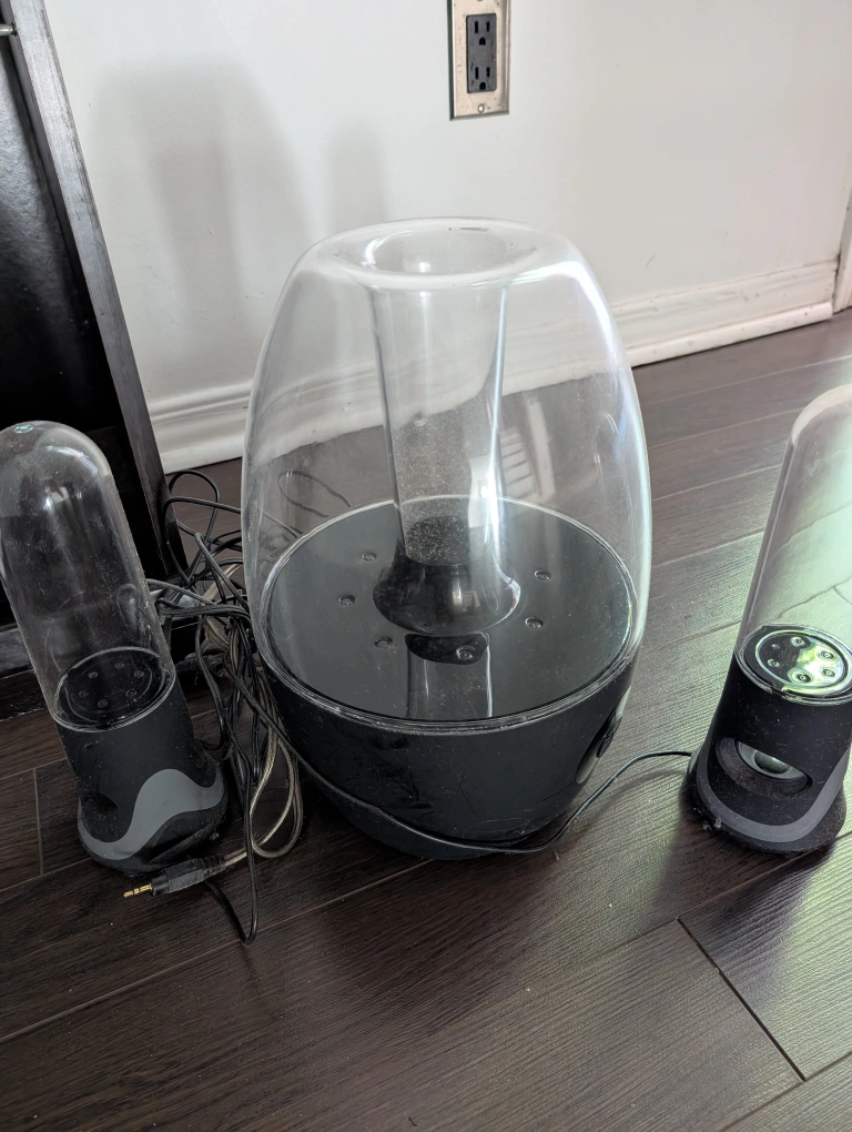 Selling a Harman Kardon Soundsticks III speaker system. It includes the subwoofer and two satellite speakers. A few signs of wear, but still sounds great! Lights up.