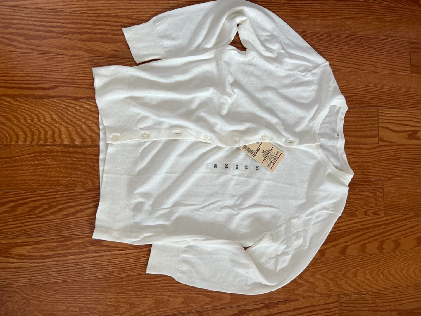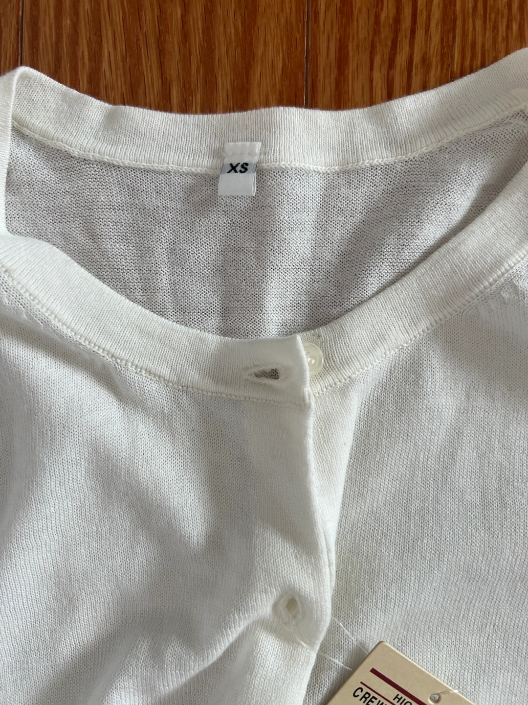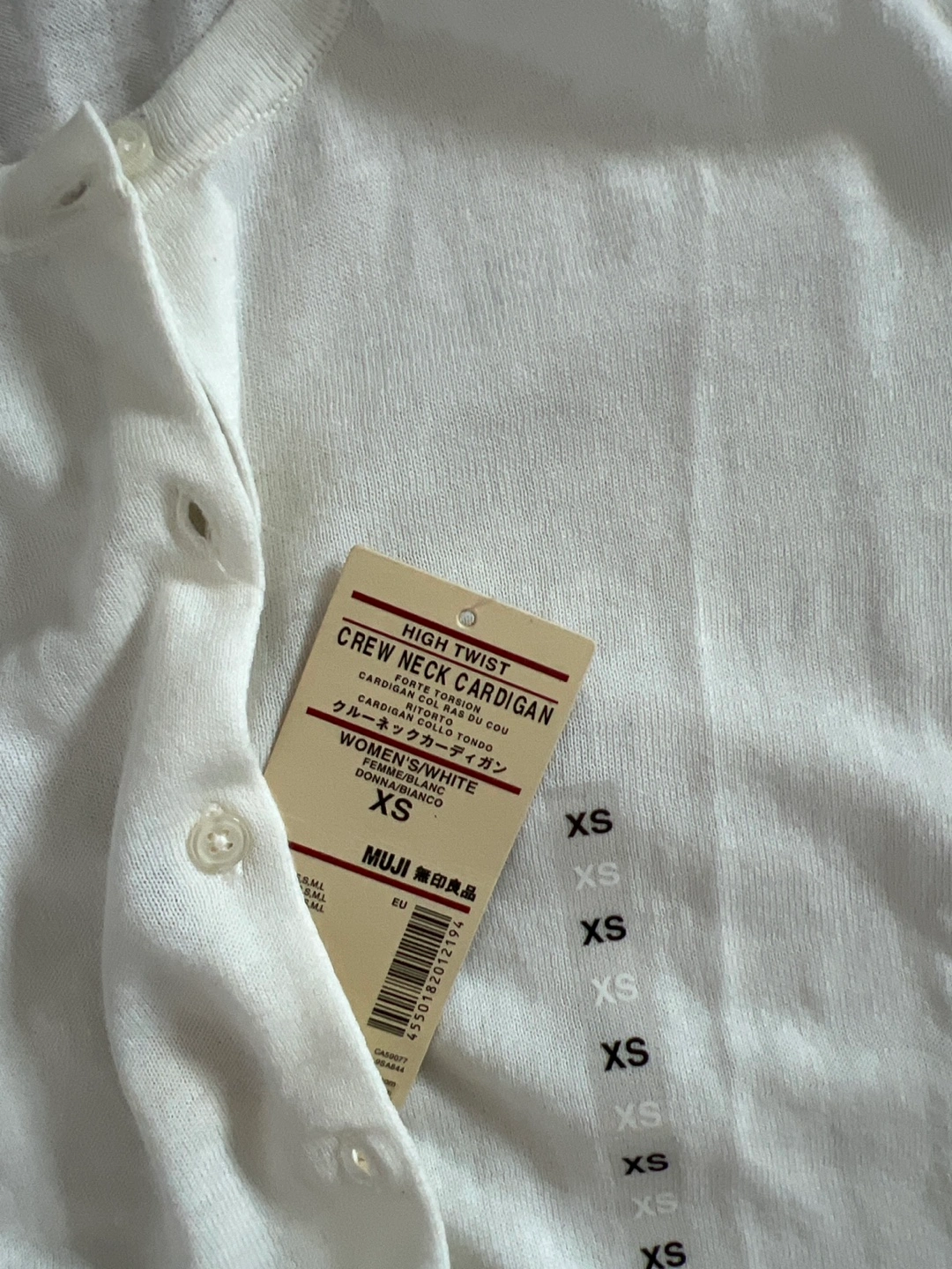 This is a brand new MUJI High Twist Crew Neck Cardigan in size XS! It's a women's style in white. The tag is still attached. It's a lovely, lightweight cardigan perfect for layering
