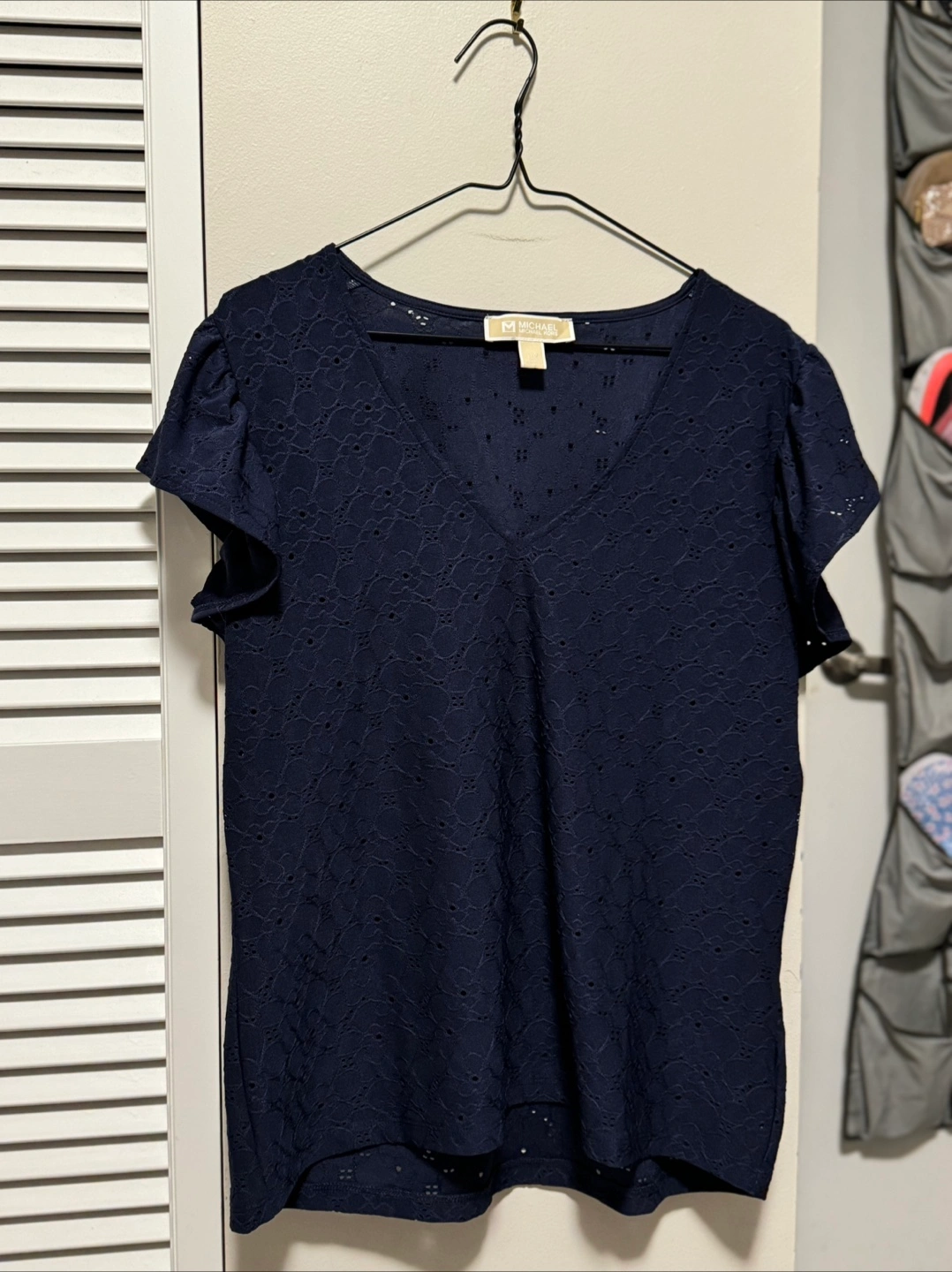 This is a beautiful navy blue lace top from Michael Kors! It's in great condition and has a flattering V-neck. Perfect for dressing up or down!