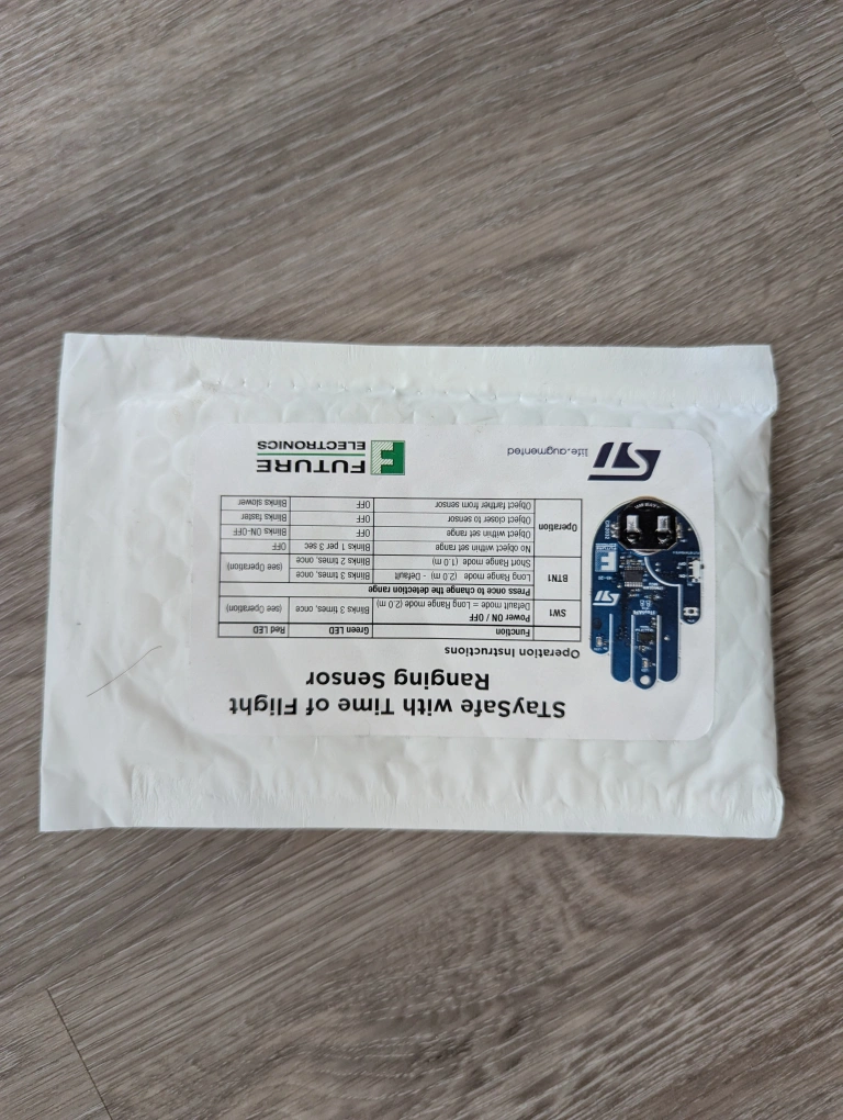 Selling a STMicroelectronics StaySafe with Time of Flight Ranging Sensor. It includes operation instructions and details on power on/off, range modes, and LED indicator functions. It shows how the sensor behaves when objects are within, closer, or farther from the set range. Great for electronics projects!