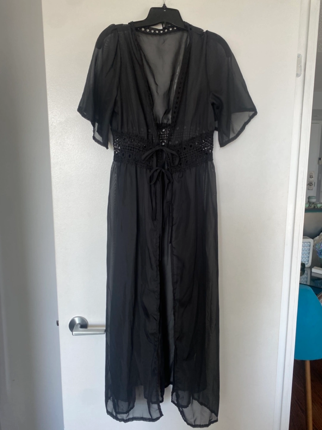 Selling a stylish black sheer swimsuit cover-up in size small! It's made of 65% cotton and 35% polyester, so it's lightweight and comfy. Perfect for layering or wearing as a beach cover-up Check out my other posts, lots of new beauty products, lightly used clothing, shoes some still with tags on
