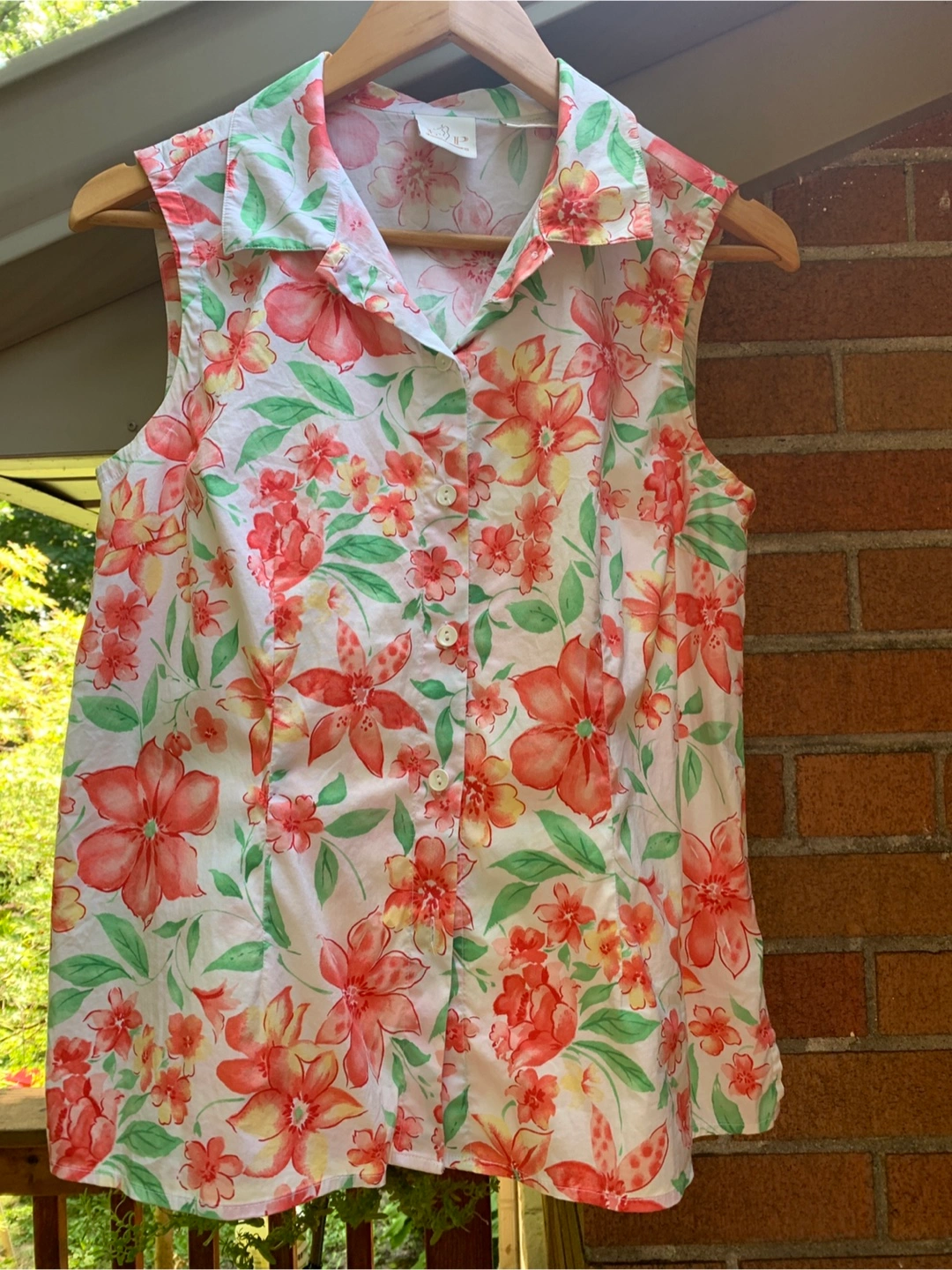 Here's a lovely EP Pro sleeveless summer blouse in size M! It features a beautiful floral pattern with colours of coral, green, and yellow. I believe they are hibiscus flowers. The material is 97% cotton and 3% spandex, making it comfortable and breathable for warmer weather and provides a bit of stretch. A beautiful colourful print for this hot, humid weather! Cash only please.