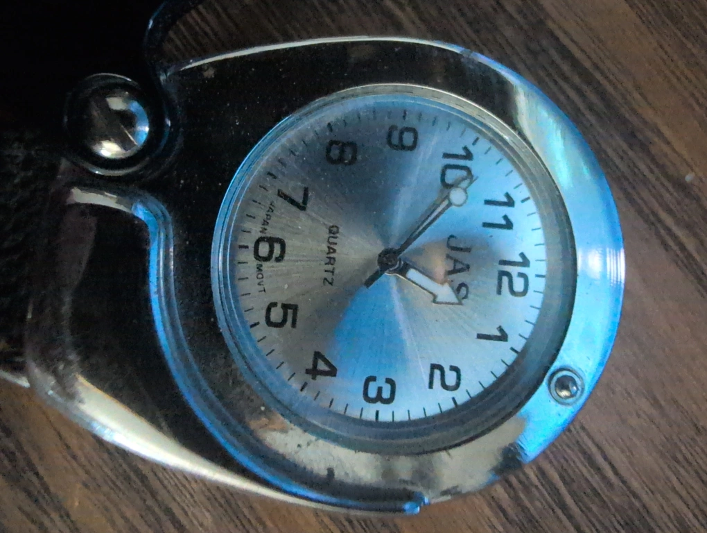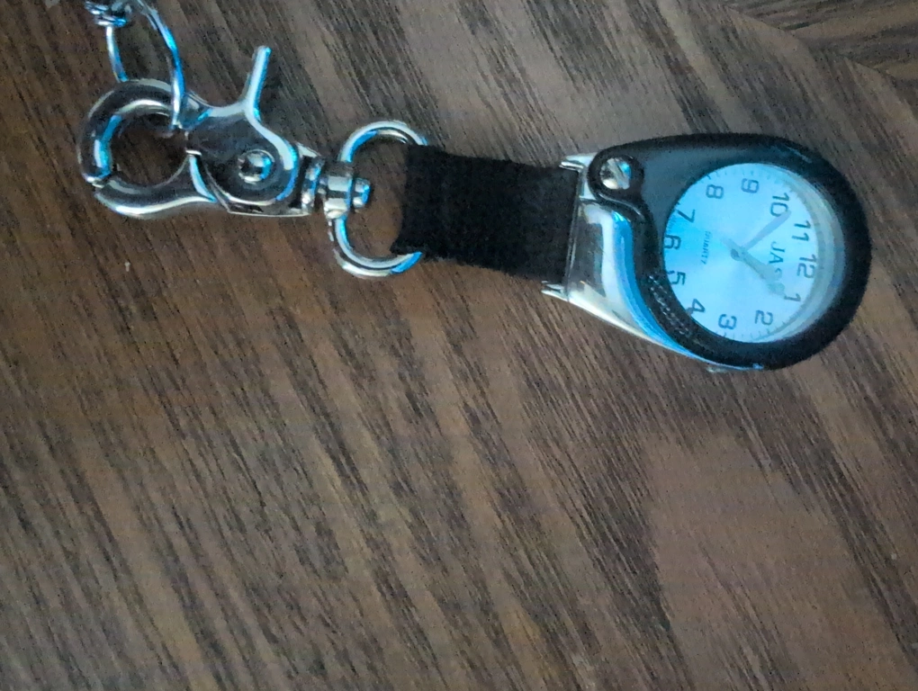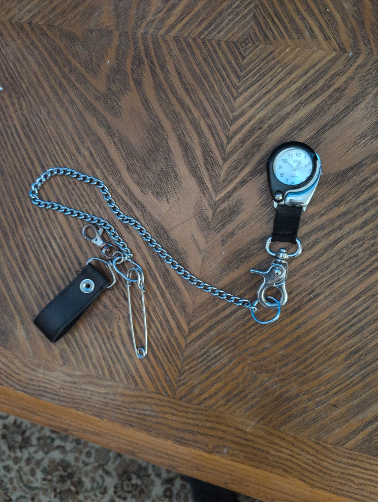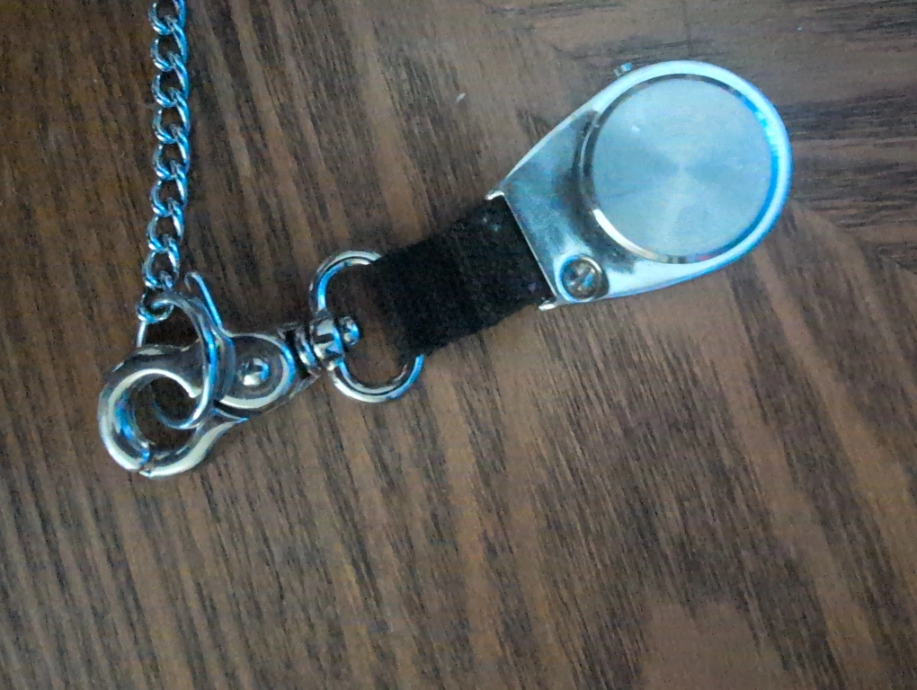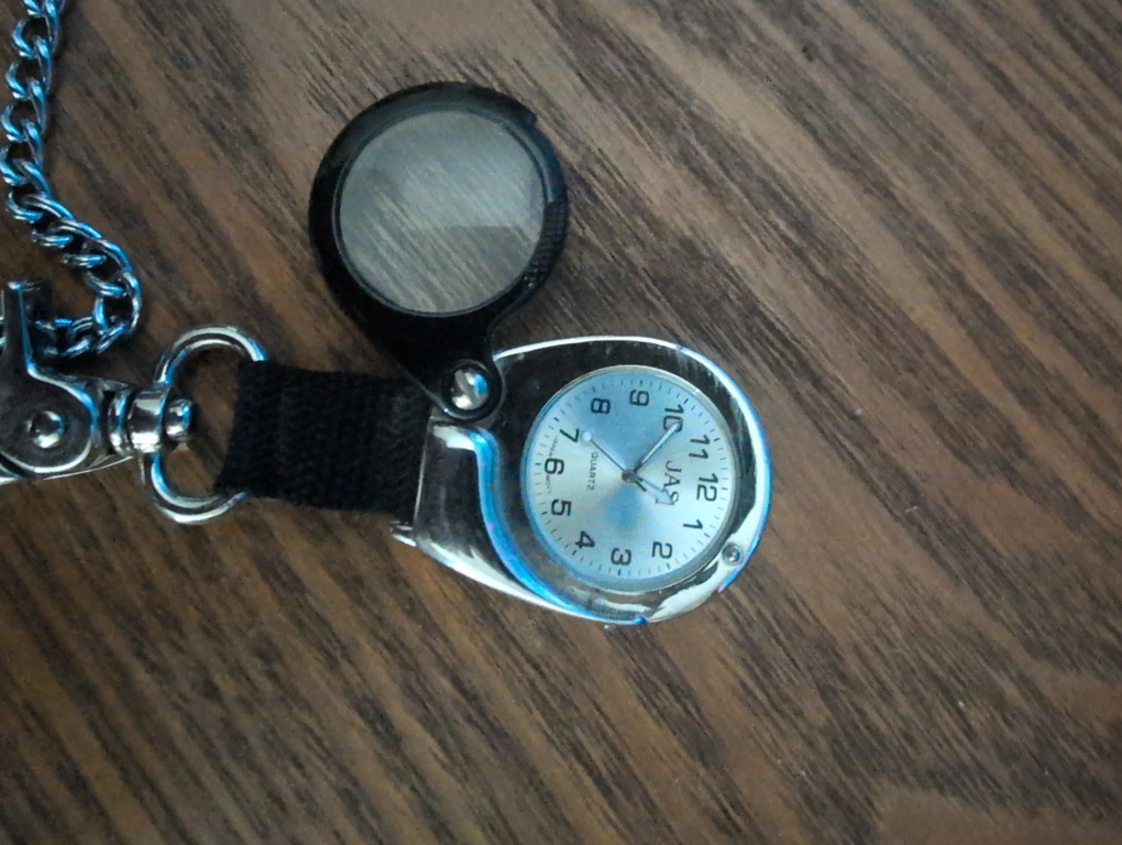 Here's a pocket watch that comes with a handy magnifier! It has a chain and clip, making it easy to attach to your belt loop or bag. The watch face is easy to read, and the magnifier is great for😉 those times you need a little extra help seeing details