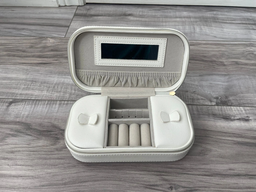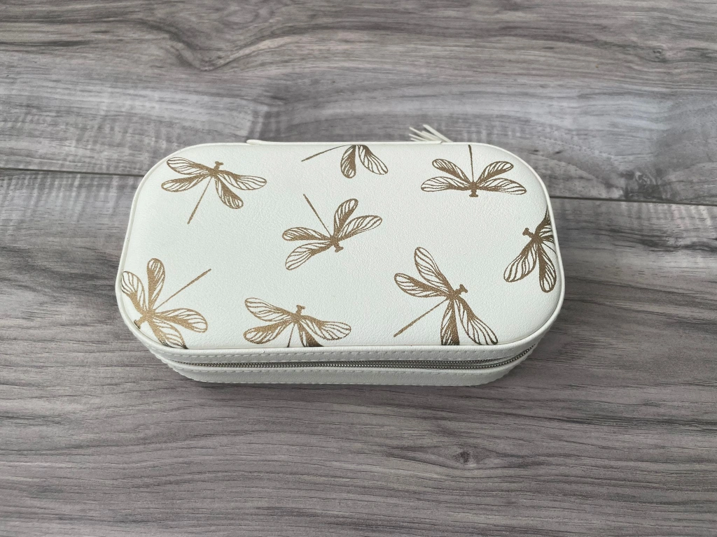 Keep your jewelry safe and organized on the go with this cute white travel case! It features a lovely dragonfly pattern and a soft interior to protect your precious pieces