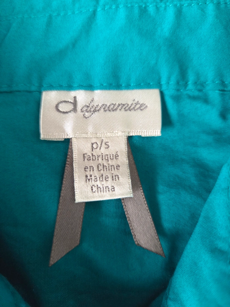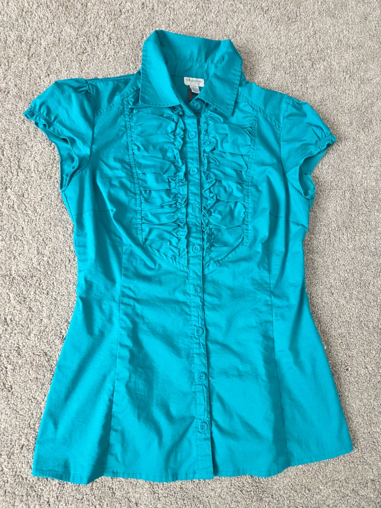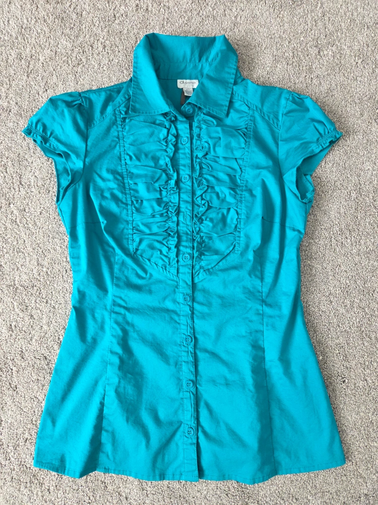 A cute teal shirt from Dynamite! It's a size Small but looks XS, and features a button-down front with ruffled detailing. Perfect for adding a pop of colour to your wardrobe! if interested pick up near Gateway station, Surrey central or guilford mall. cash only pls.