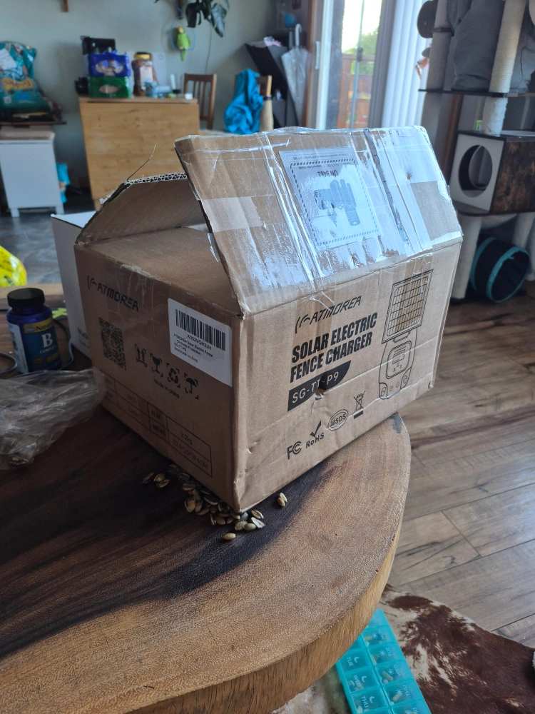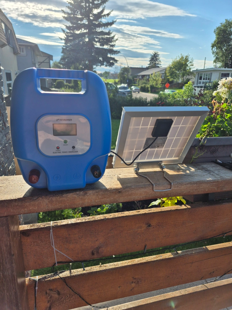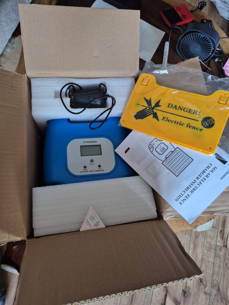 Selling an ATMOREA solar electric fence charger, model SG-TT P9. It's in great condition and comes with the original box. This 10W solar panel is ideal for livestock, pet, poultry, gardens, and orchards protection, with a 5-mile range. It features reliable performance in multiple weather conditions and is IP65 waterproof. The charger also provides lightning protection. The box is included!