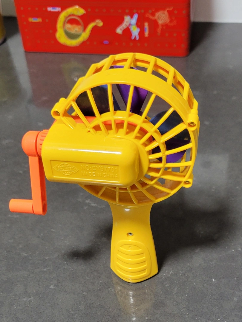 Here's a fun little hand crank fan! It's yellow with colourful blue and purple fan blades. Just crank the handle and feel a breeze! Cash only. Pick up only. Get it before it's donated. Final sale.