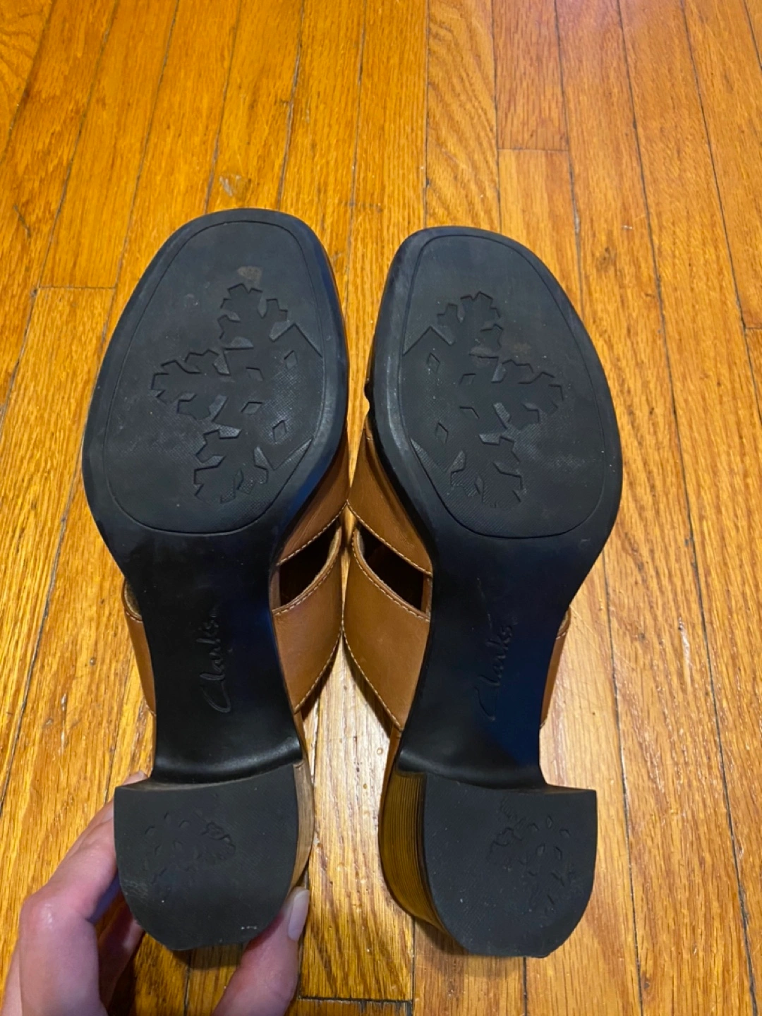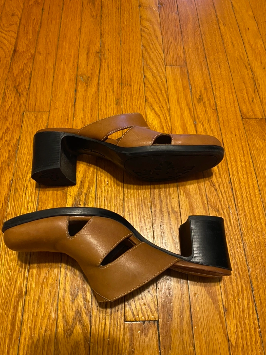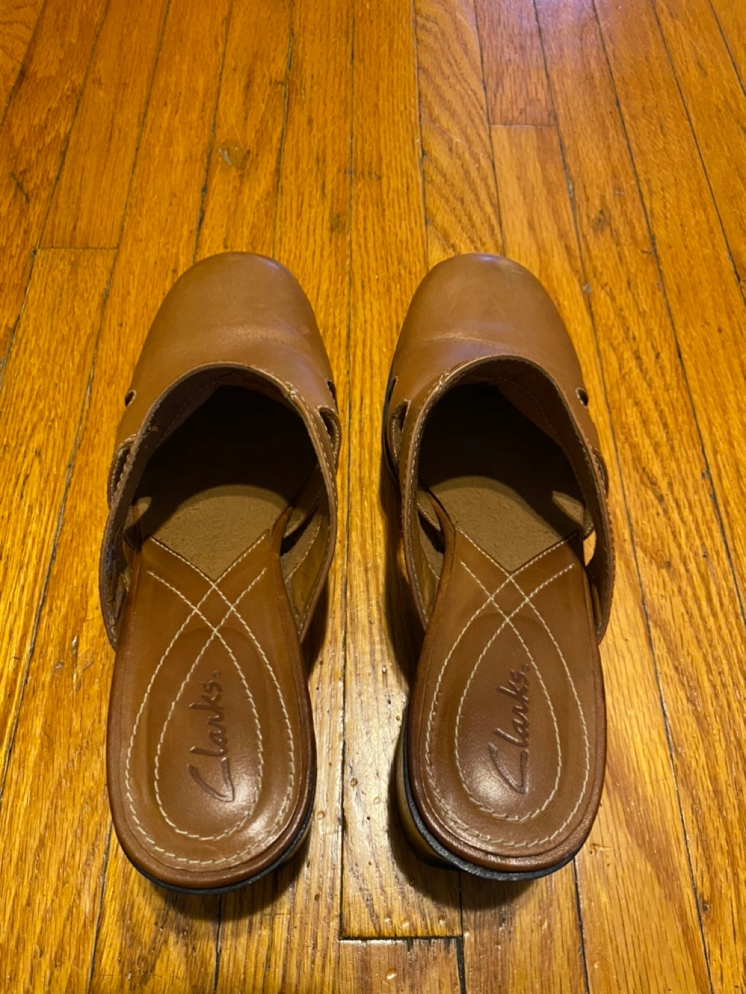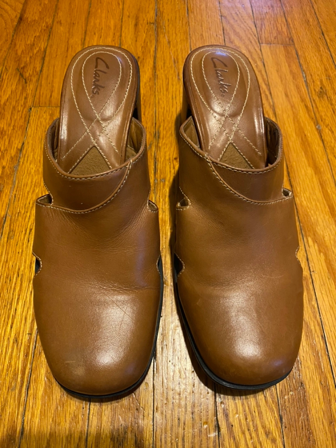 These are a pair of brown leather mules from Clarks. They are in great condition and ready for a new home! They feature a comfortable heel and a stylish, versatile design.