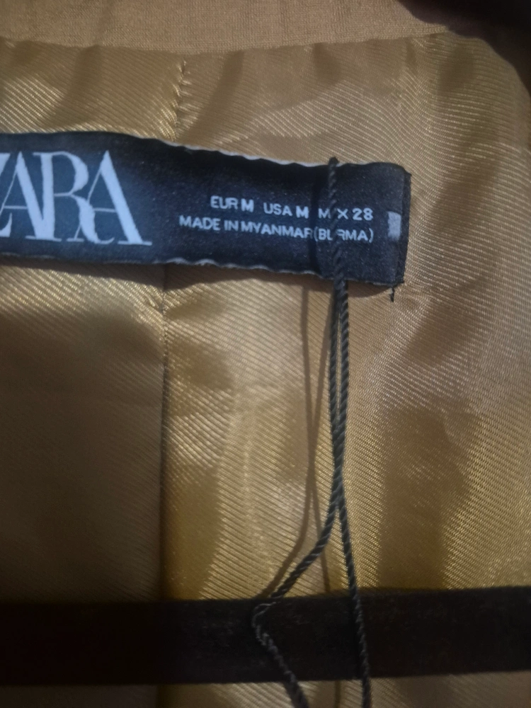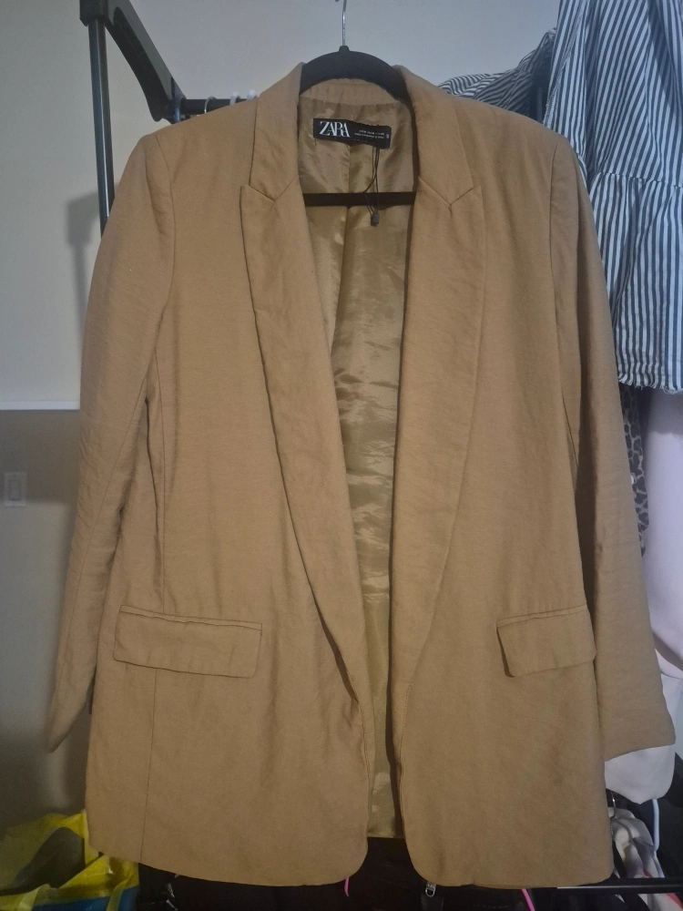 Selling a Zara blazer in a size medium. It's a tan colour and in good condition. Perfect for adding a touch of style to any outfit!