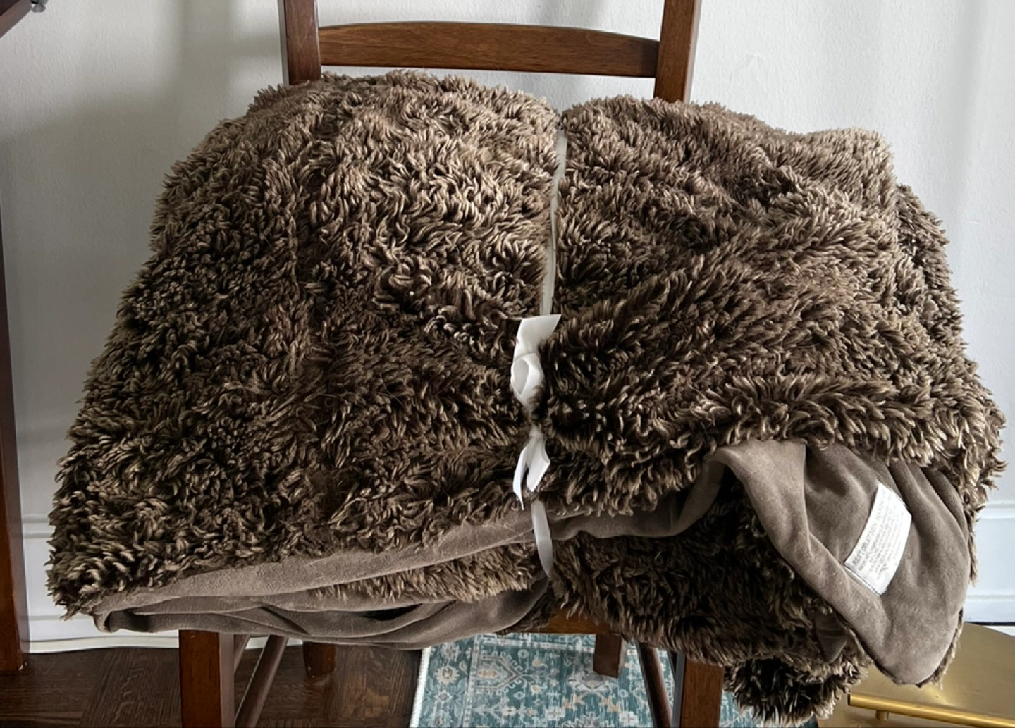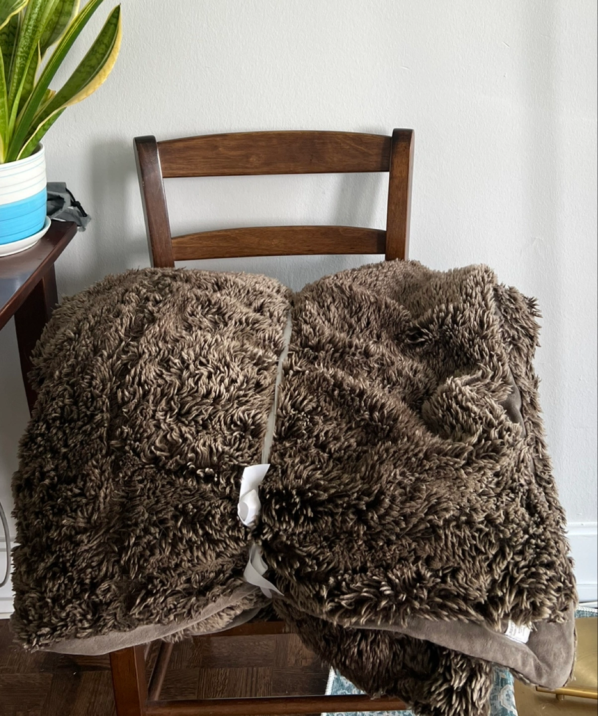 Super cozy warm blanket, perfect for chilly evenings. Can also be used as a throw blanket, add to your home aesthetics or cottage. Queen size. Still in good condition. Purchased for $200+tax. Great deal for the quality, material, size and condition. Pick up St. George metro station. Cash only.