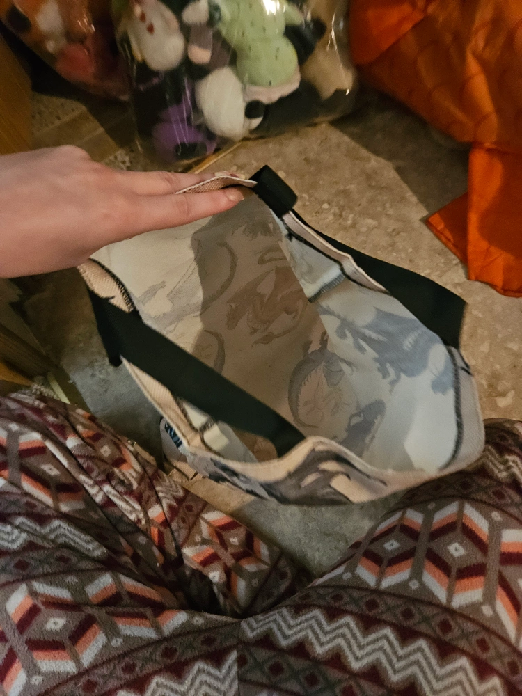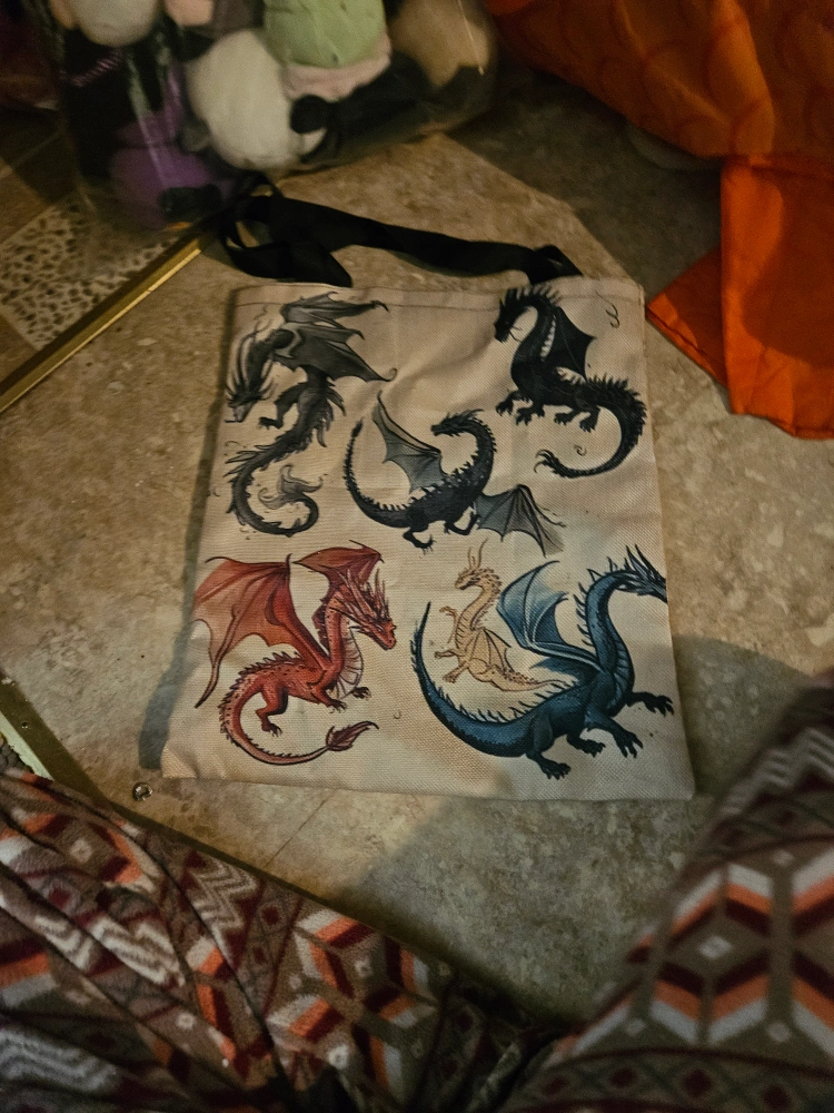 Here's a tote bag with a cool dragon print! It features several different dragons in various colours. Perfect for carrying your books or groceries