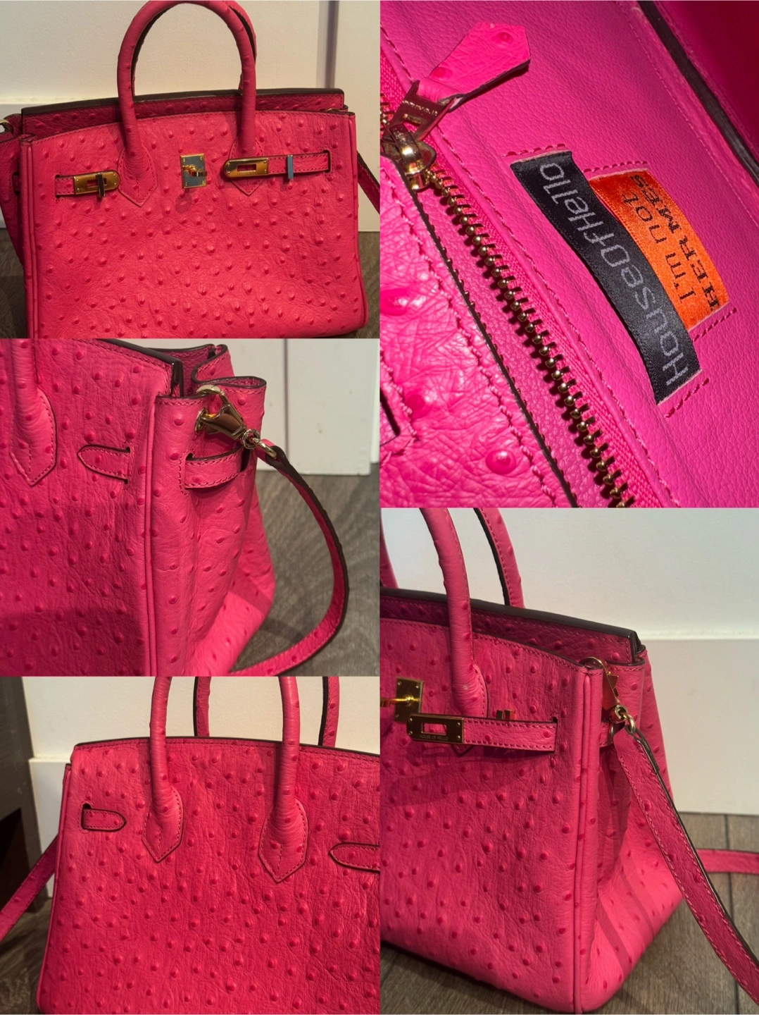 Check out this vibrant pink handbag! It's made of ostrich leather and has a unique texture. It's sure to add a pop of colour to any outfit