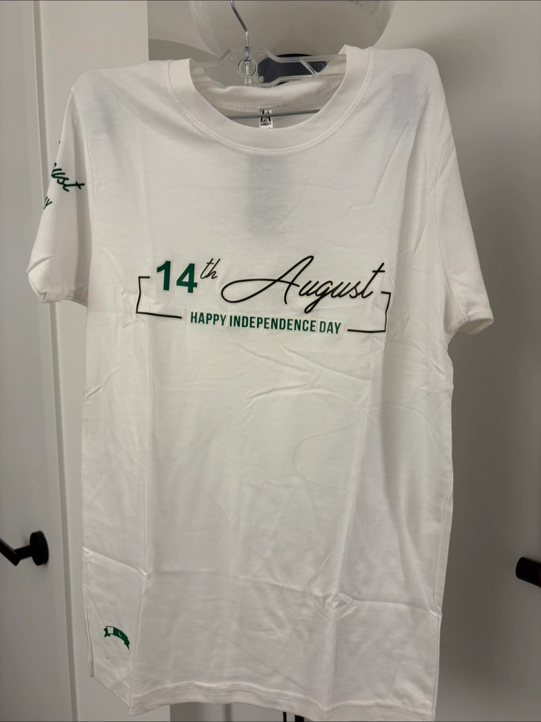 White t-shirt with a design for Independence Day. It features a flag and says '14th August Happy Independence Day'