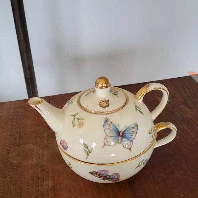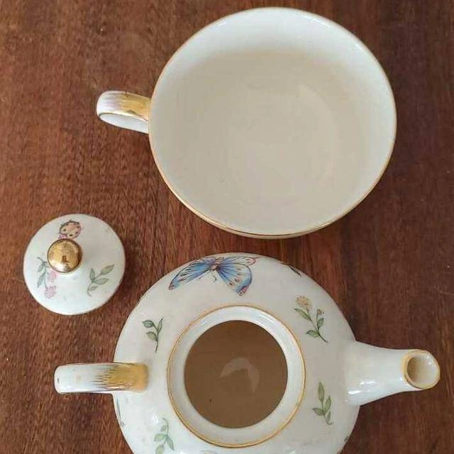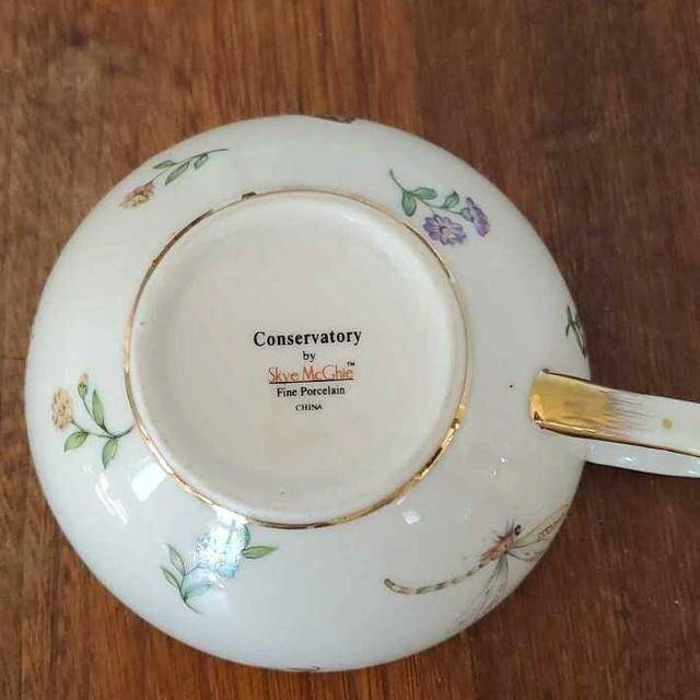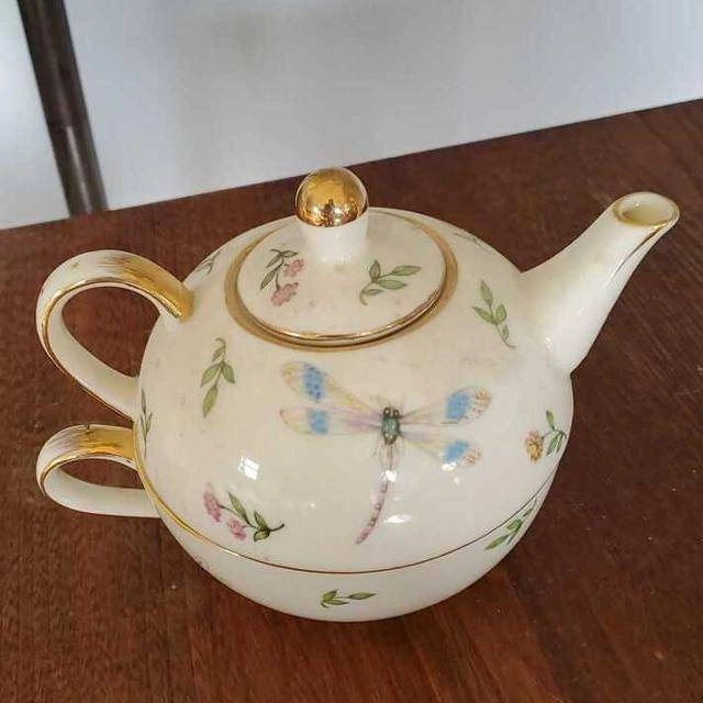 Elegant tea-for-one set featuring a teapot that nests perfectly atop a matching cup. Adorned with delicate dragonfly, butterfly, and floral designs, accented with gold trim. Fine porcelain craftsmanship by Skye McGhie, “Conservatory” collection. Excellent condition – no chips or cracks. A charming piece for tea lovers or collectors.