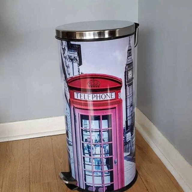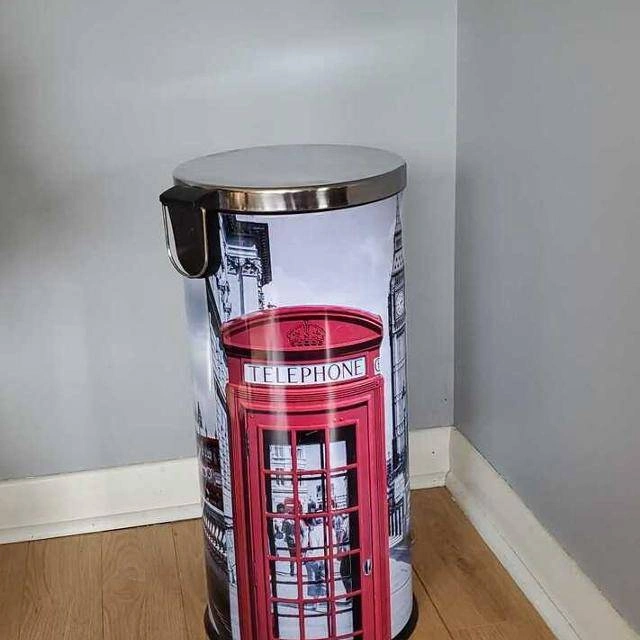Add a touch of British charm to your space with this stylish pedal-operated trash bin featuring a vibrant red London telephone booth design against a monochrome city backdrop with Big Ben. Made with a sturdy stainless steel lid and foot pedal for hands-free use. Condition: One side in great condition, the other side slightly faded (see photos). Size: 26" H x 12" W x 12" D