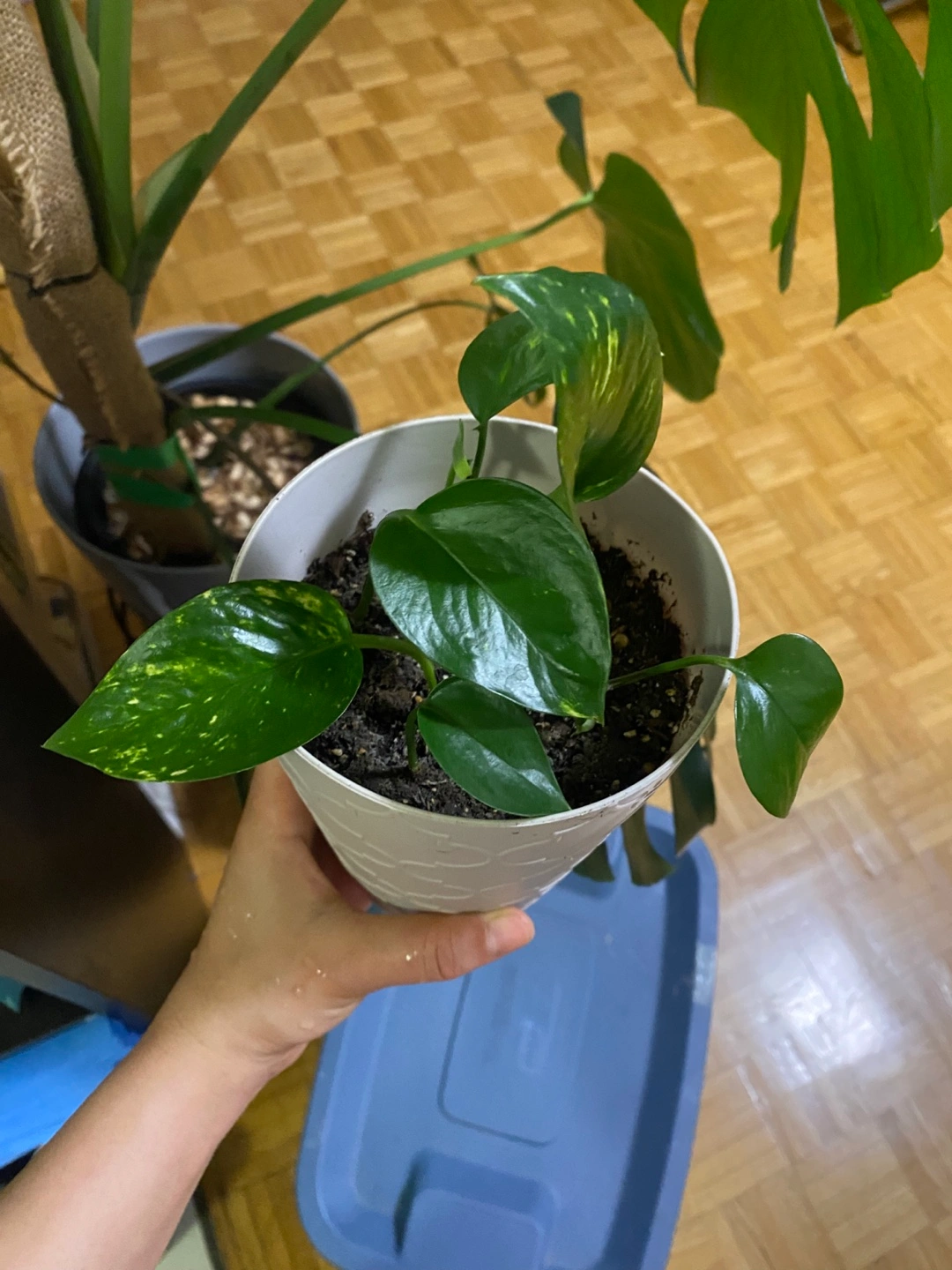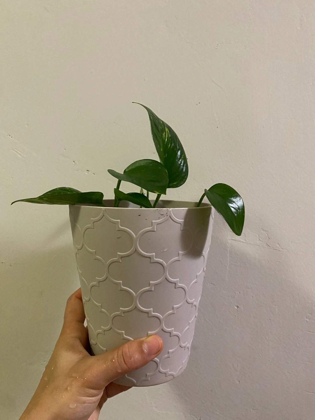 I'm selling a healthy golden pothos plant in a decorative white pot! It's perfect for adding a touch of greenery to your home or office. This plant is easy to care for and thrives in a variety of conditions