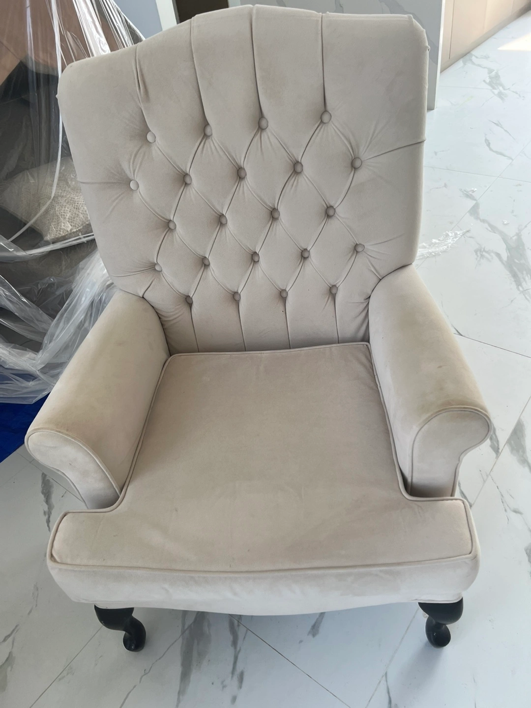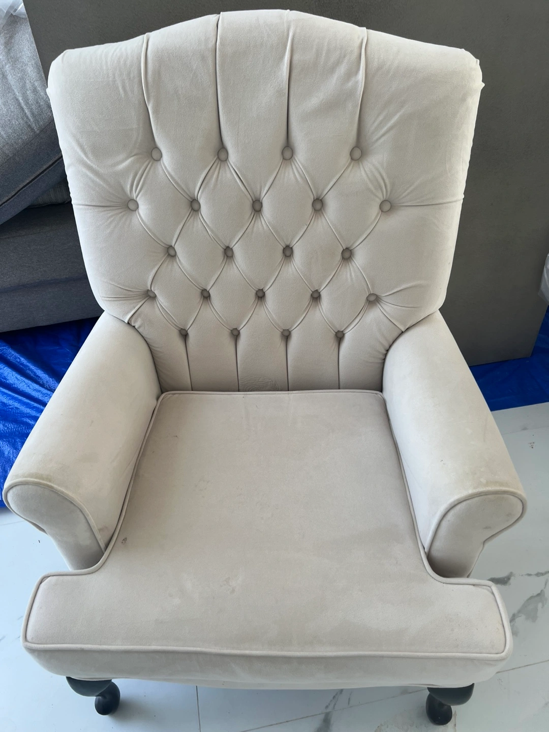 Here's two comfy beige armchairs with a tufted back. It's perfect for adding a touch of elegance to any room in your home. The chair is in good condition and ready for a new home! Each for $100
