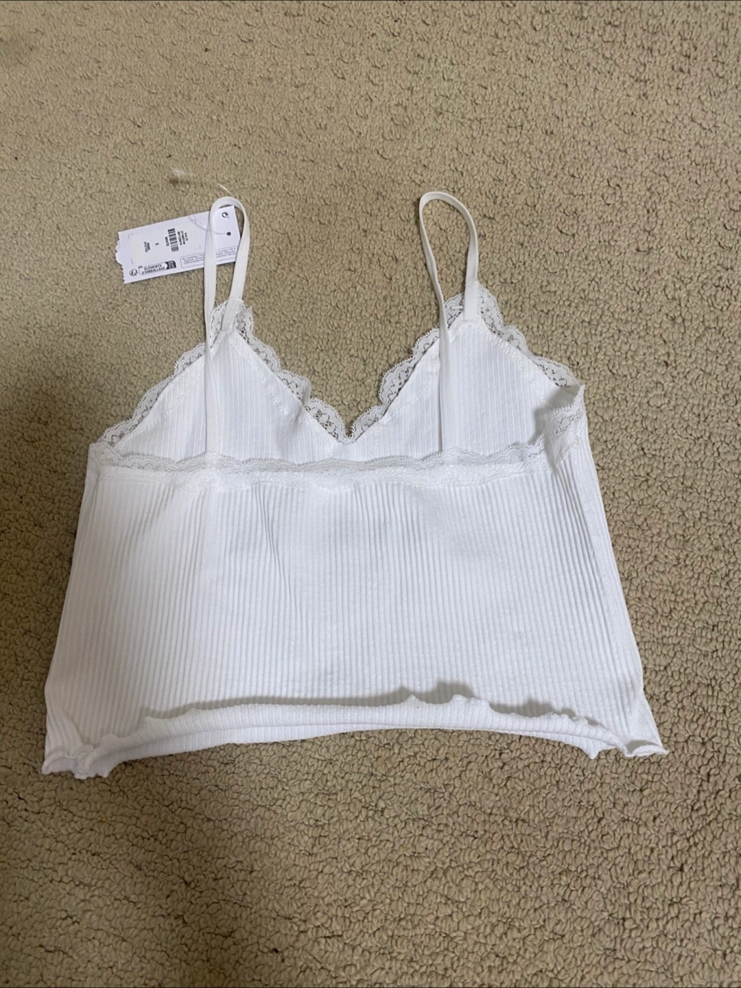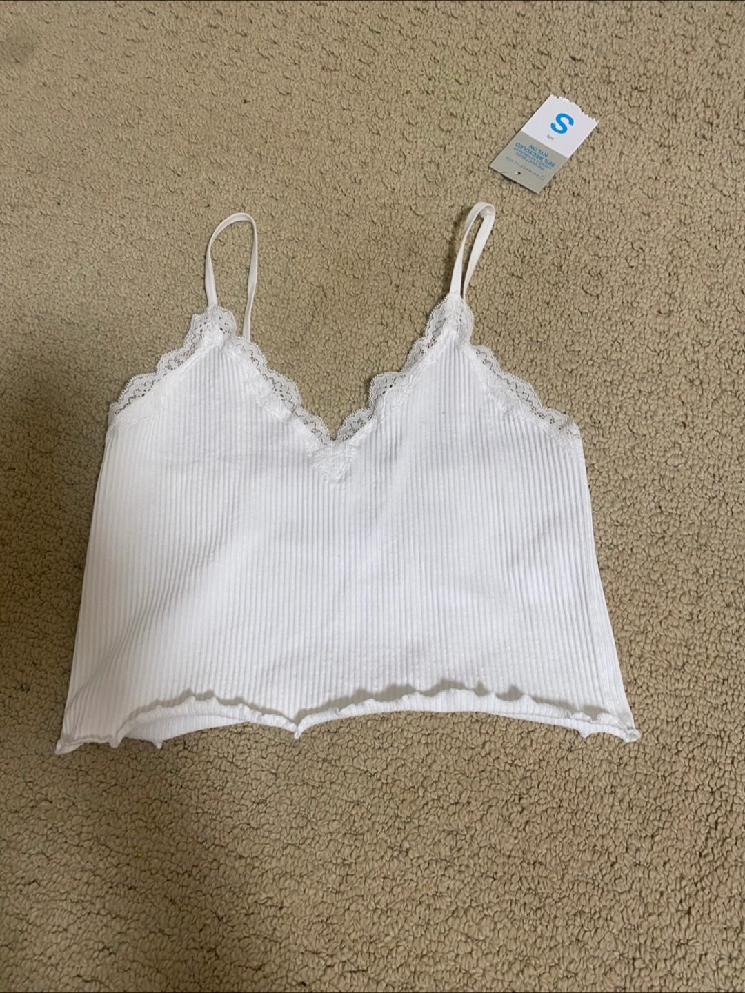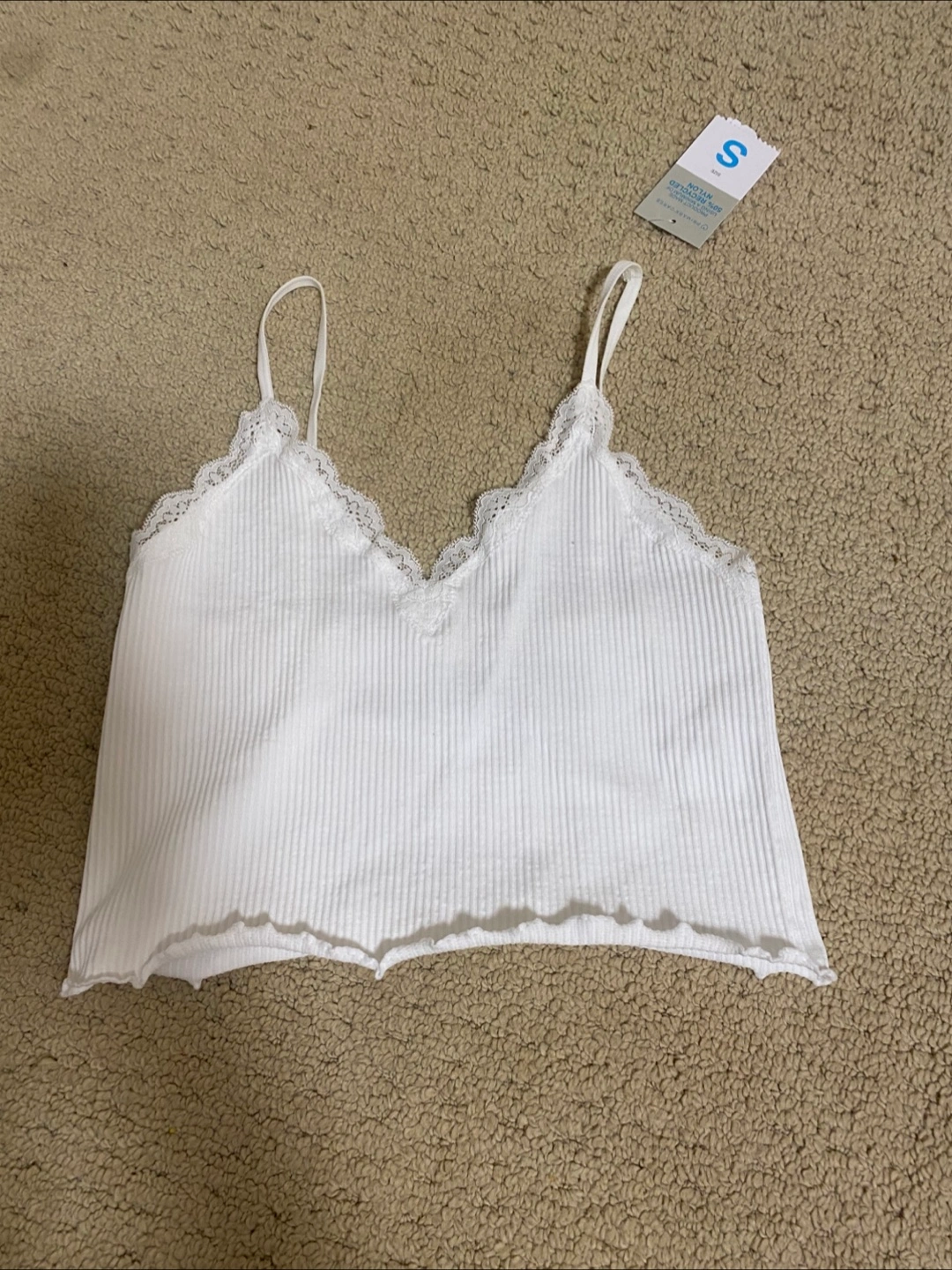 A cute white cami top, perfect for layering or wearing on its own! It's a size small and features a delicate lace trim. The material is soft and ribbed, making it super comfy for everyday wear. Brand new