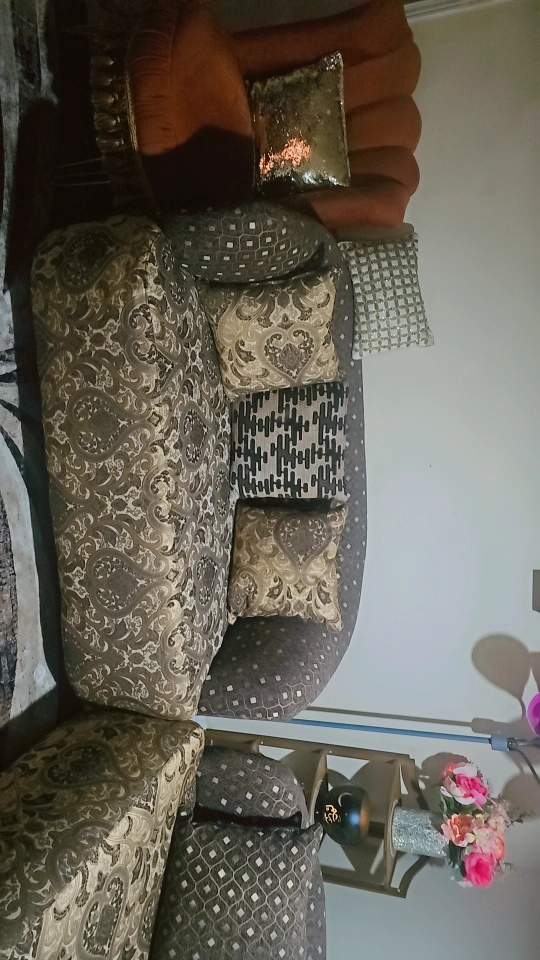 Selling a comfy sofa set with patterned fabric and matching pillows! It's in great condition and ready for a new home. Perfect for adding a touch of style to your living room or den