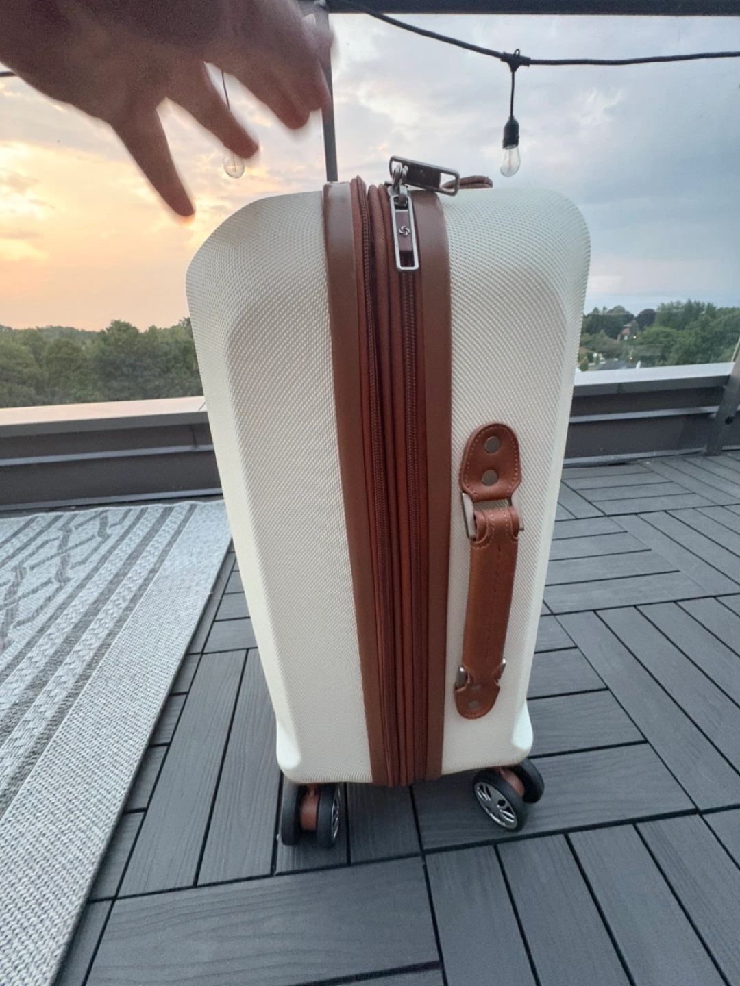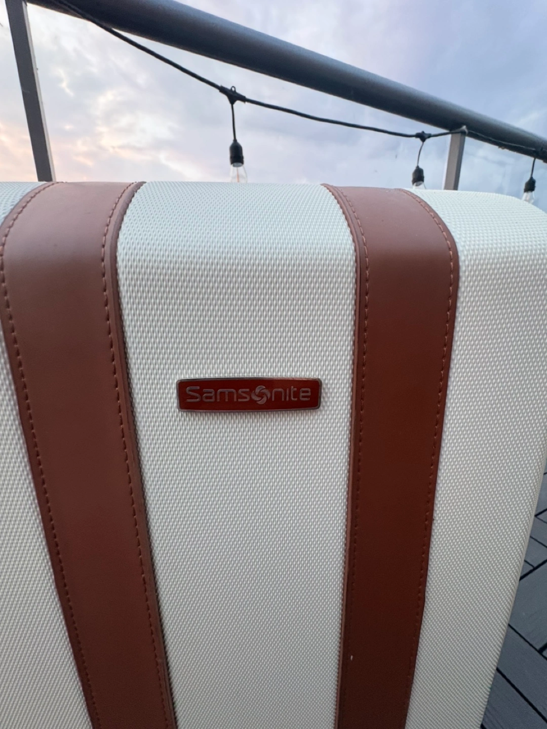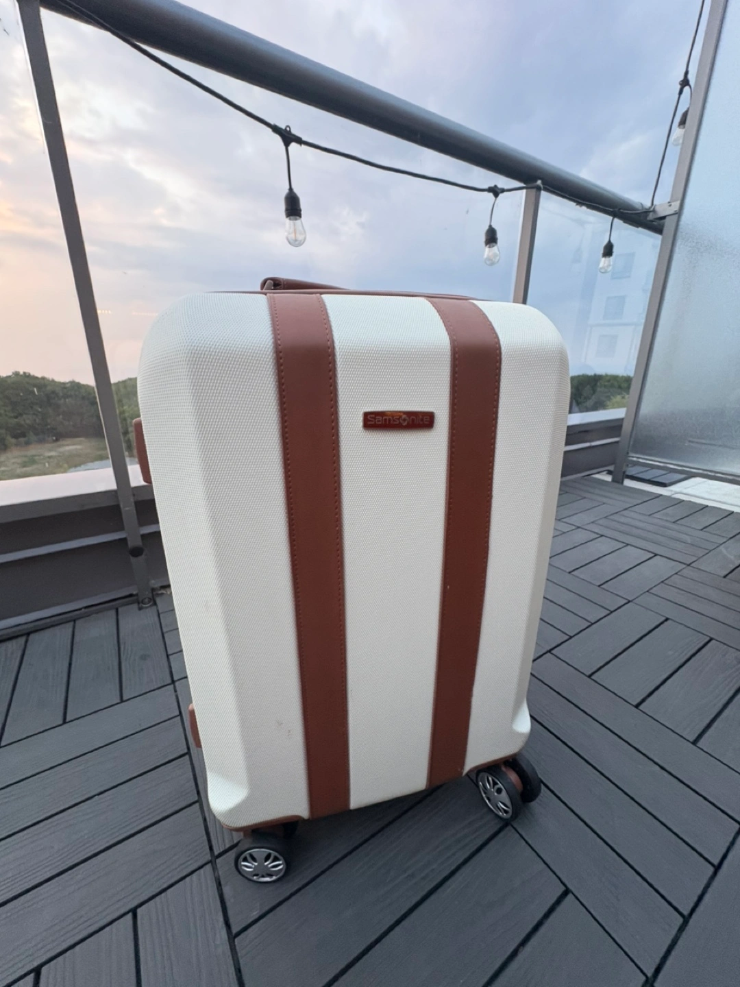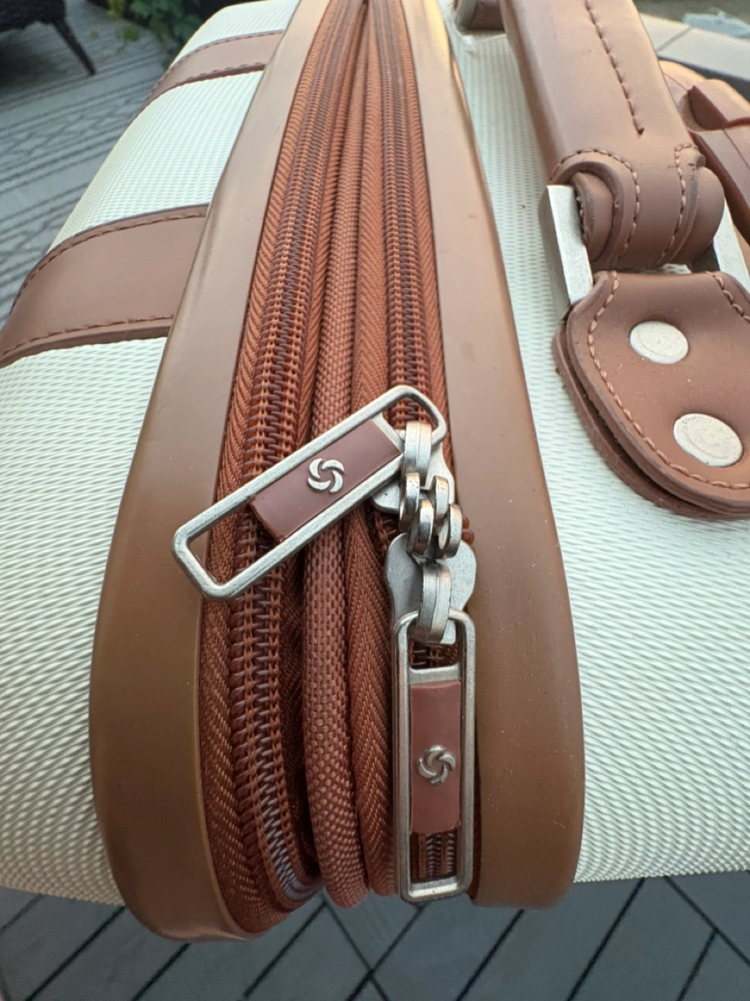 Selling a Samsonite carry-on suitcase. It's in great shape and ready for your next trip! The colour is a cream with brown accents. This suitcase features a stylish design and durable construction.